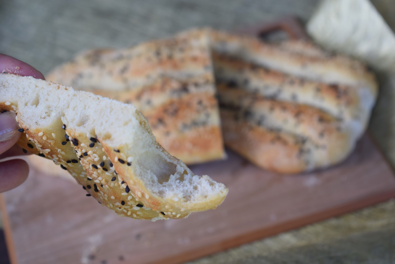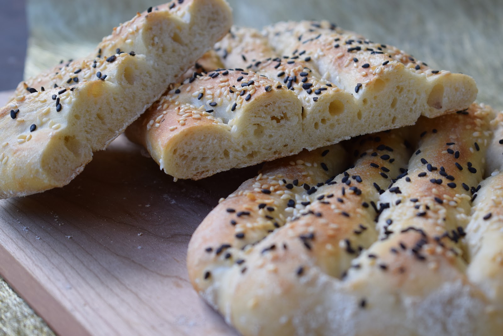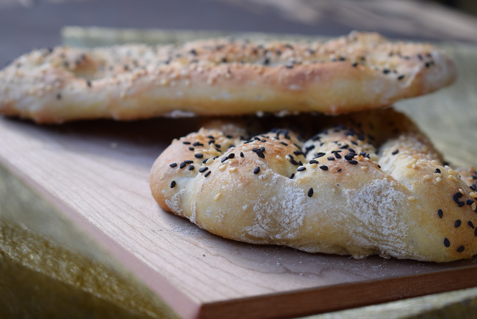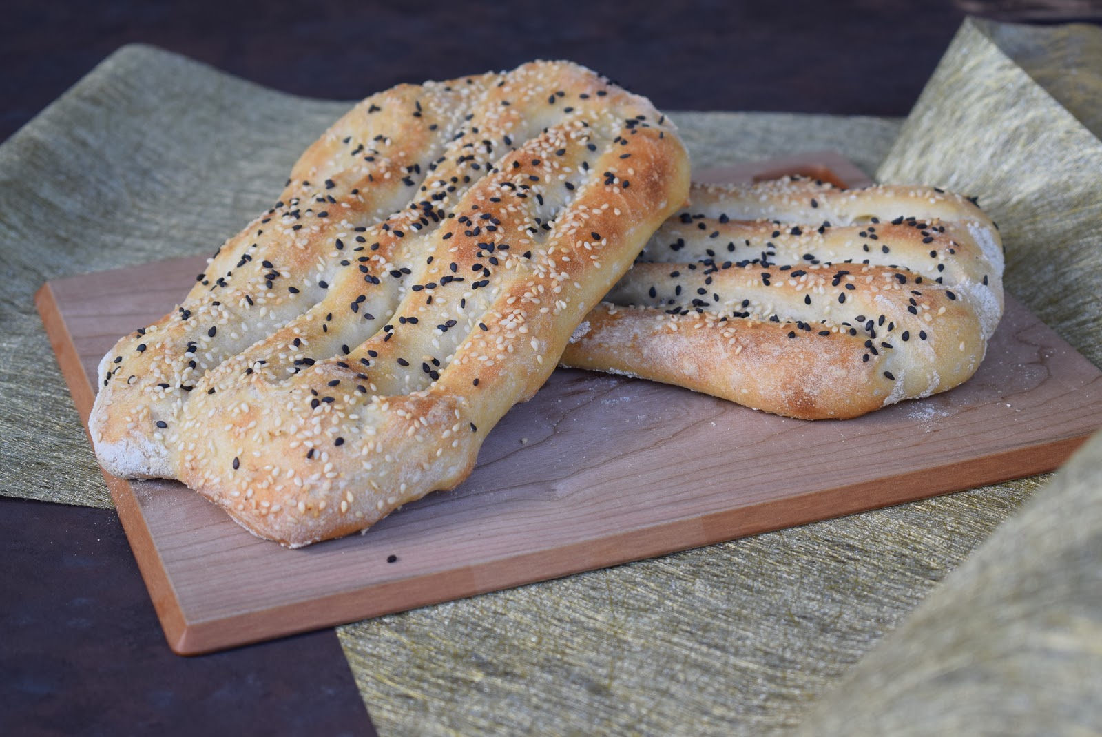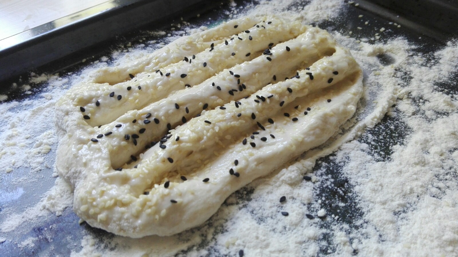 Am Ende habe ich die Teigfladen mit weißem und schwarzem Sesam bestreut.