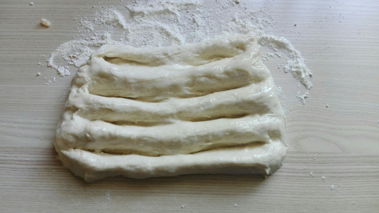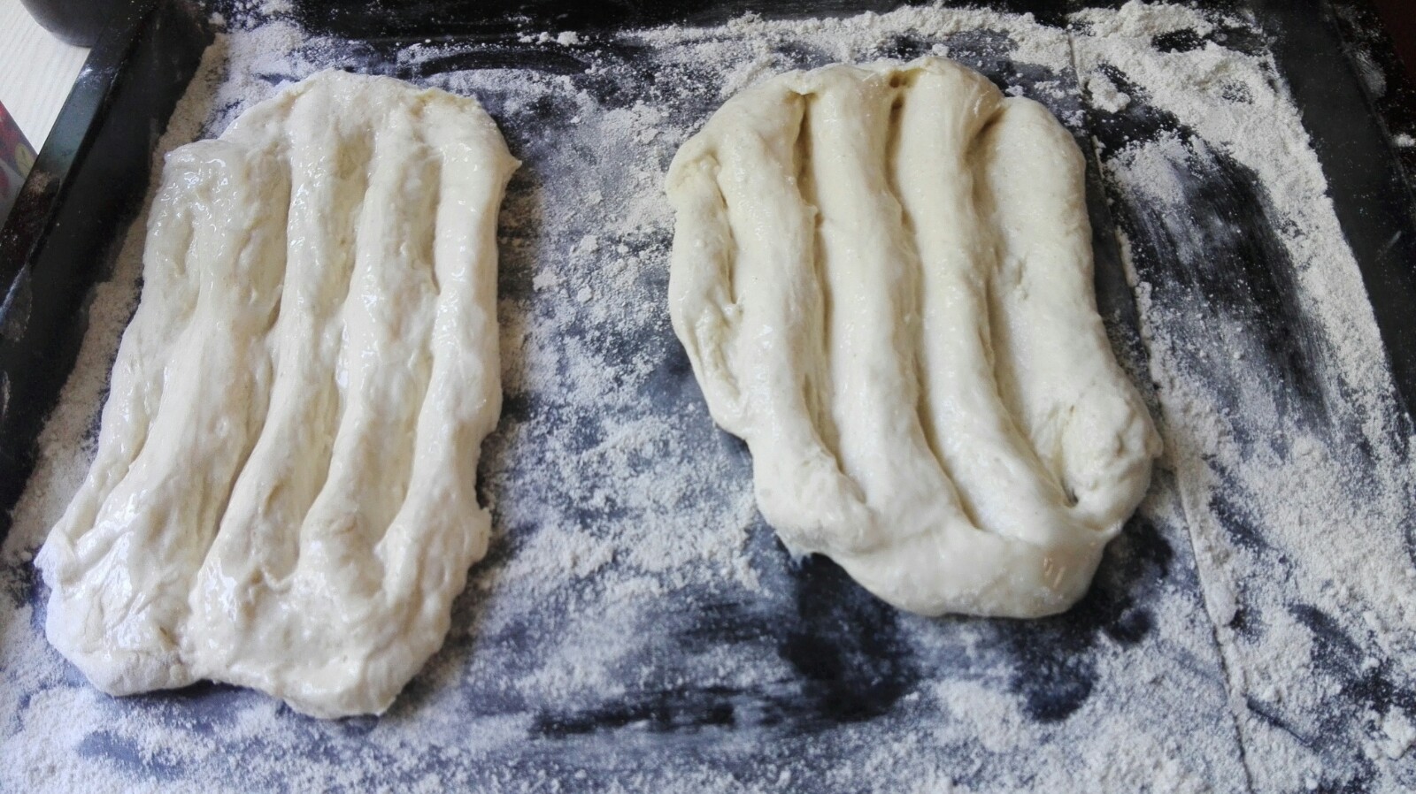 Beim Übersetzen auf das Bachblech, die Fladen nochmals in die länge ziehen, so dass sie bestenfalls die Größe des Backblechs annehmen.