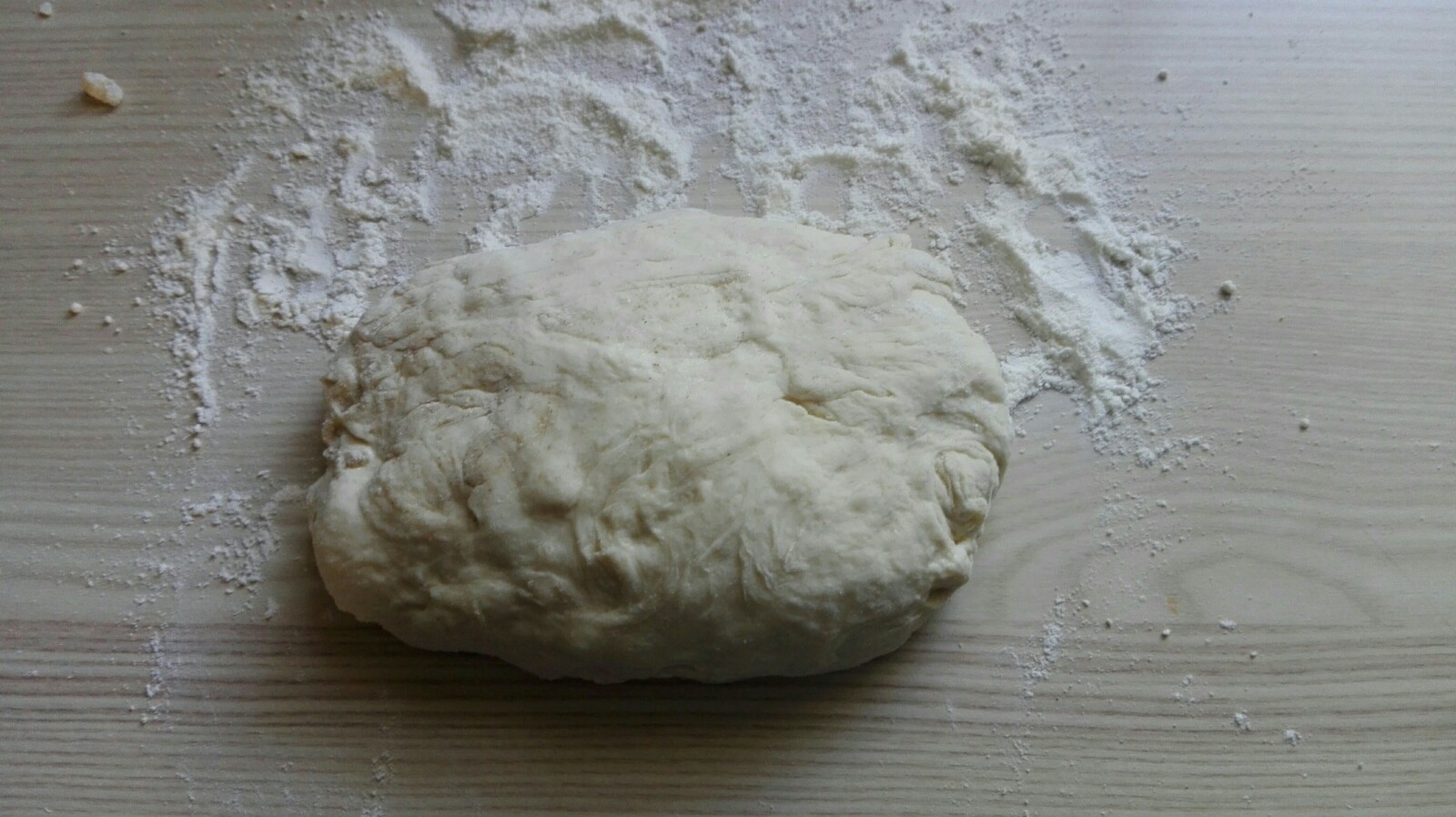 Nach den drei Stunden Mehl auf der Arbeitsfläche ausbreiten und einen Fladen nochmals durchkneten.