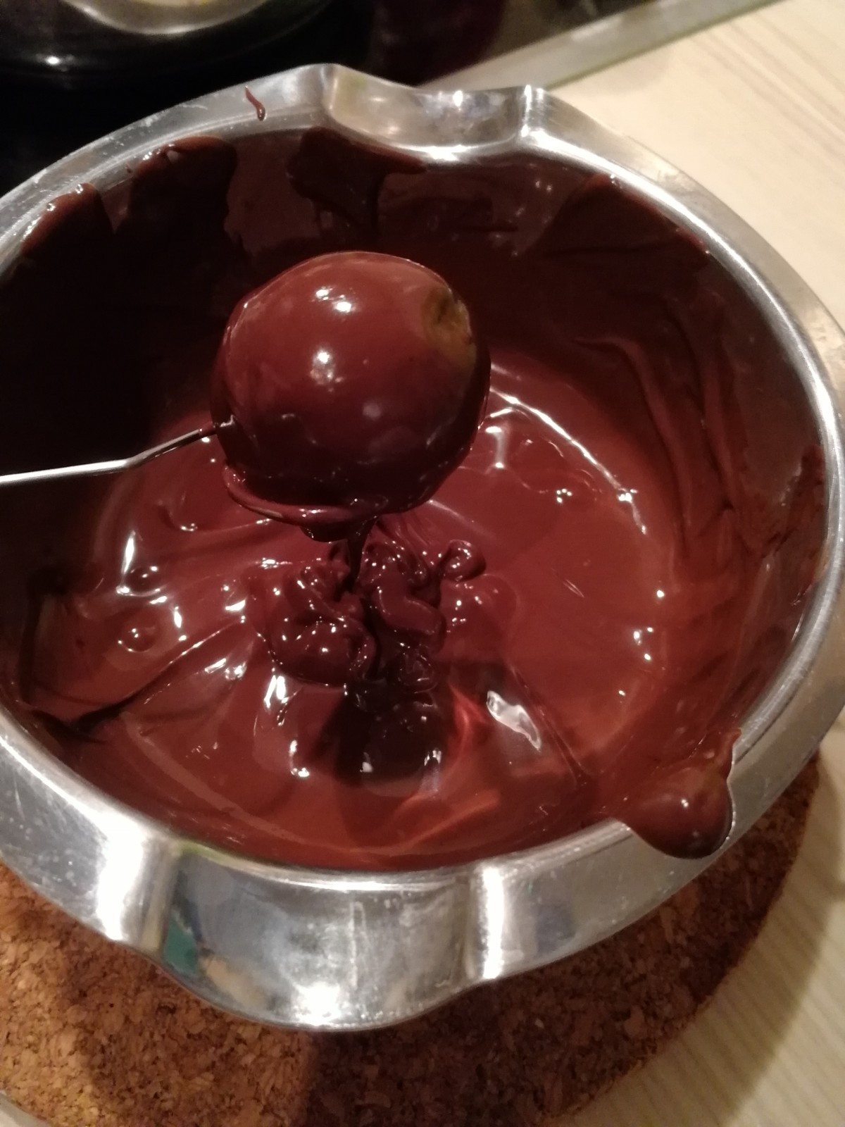 Wenn die Kuvertüre geschmolzen ist, die Kirschen unterrühren und alles kühl stellen.
