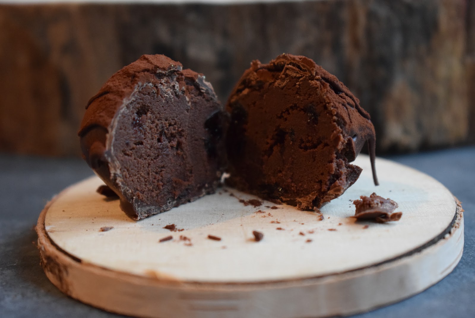 Zum Schluss Kakaopulver darüber sieben und schon sind die Amarena-Schoko Pralinen fertig.