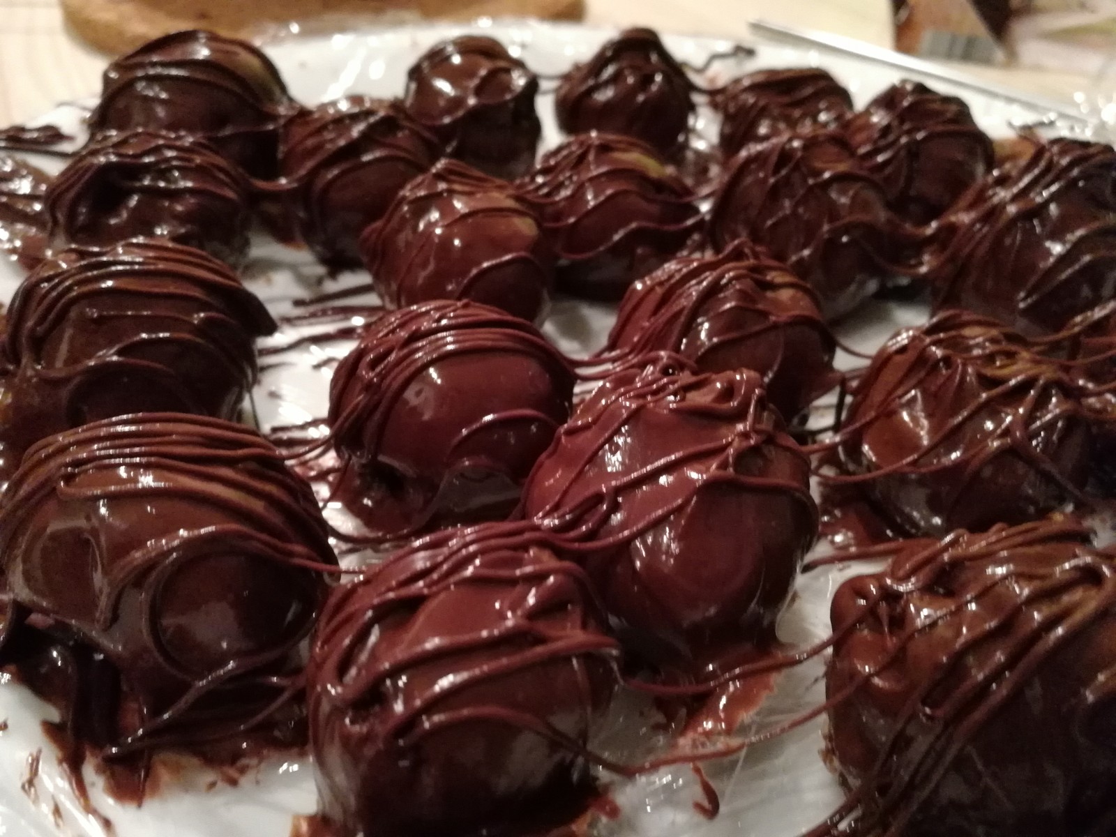 Da ich ja schon ein Dessert hatte bzw. keine weiteren Plätzchen mehr wollte, habe ich das Rezept einfach ein bisschen abgewandelt und Pralinen daraus gemacht.