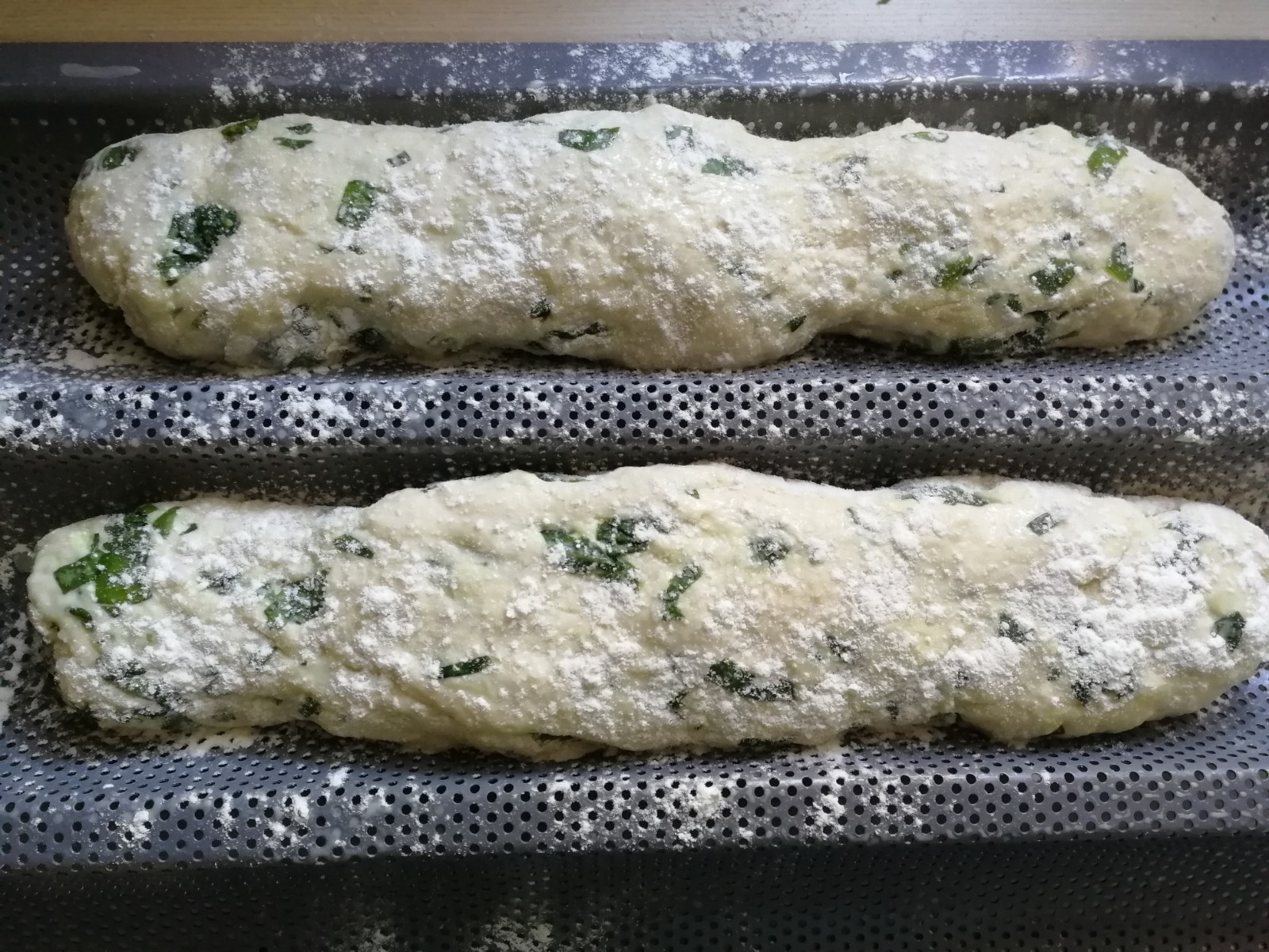 In den Teig einarbeiten und zu zwei Brotstangen formen.