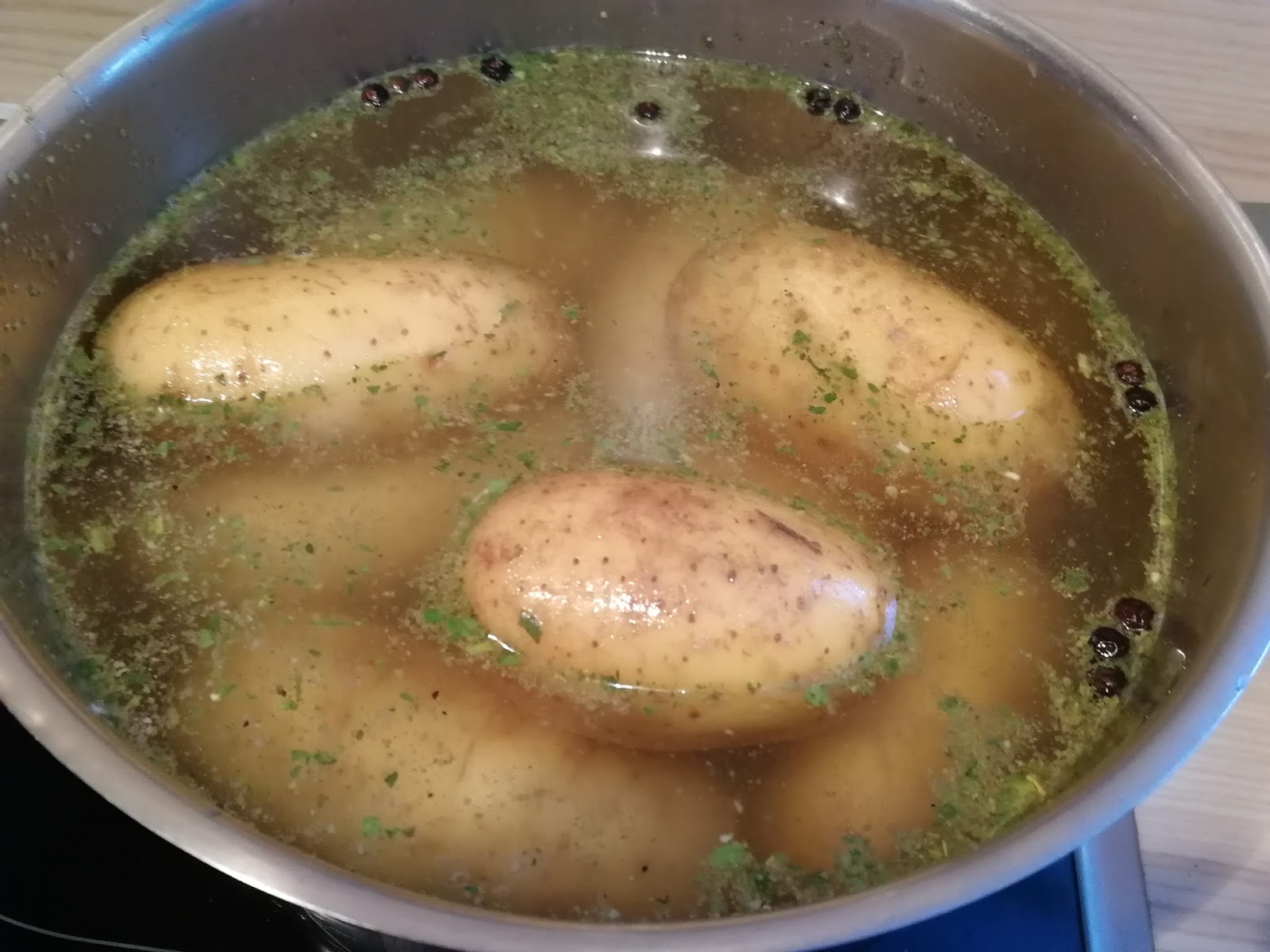 Kartoffeln mit Schale kochen. In das Wasser noch die Wacholderbeeren, Lorbeerblätter und etwas Gemüsebrühe geben. So kann der tolle Geschmack während des Kochvorgangs in die Kartoffeln übergeben. Dies mache ich bei allen Kartoffelsalaten so. (Nicht von der Menge der Kartoffeln im Bild irritieren lassen – es sind mehr. Es gab auch noch normalen Kartoffelsalat 🙂 )