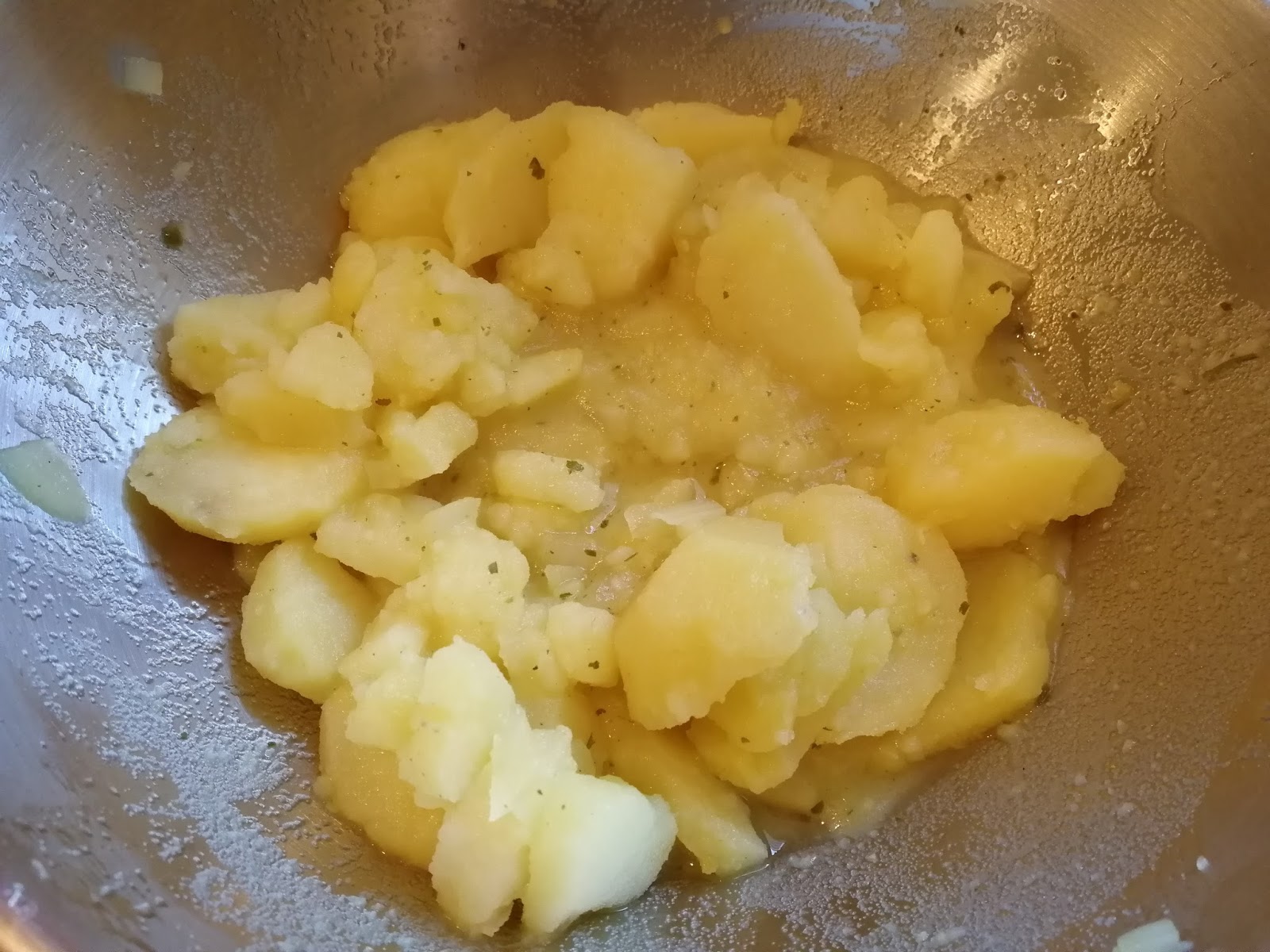 Beides zu den Kartoffeln geben und gut vermengen. Mit Salz und Pfeffer abschmecken.
