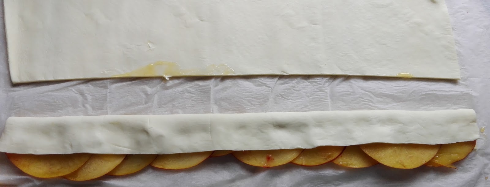 1 – gekauften Blätterteig ausrollen und einen breiten Streifen abschneiden