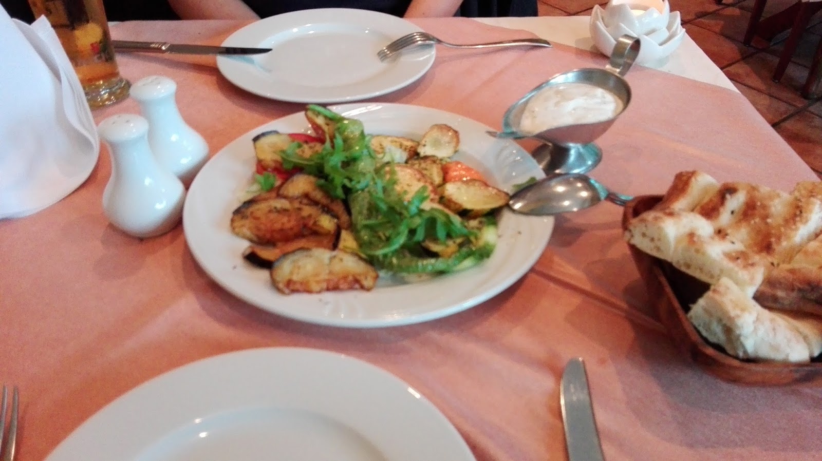 Es gab leckeres, gebratenes Gemüse mit einer Joghurtsoße mit feiner Minznote und natürlich leckerem Brot.
