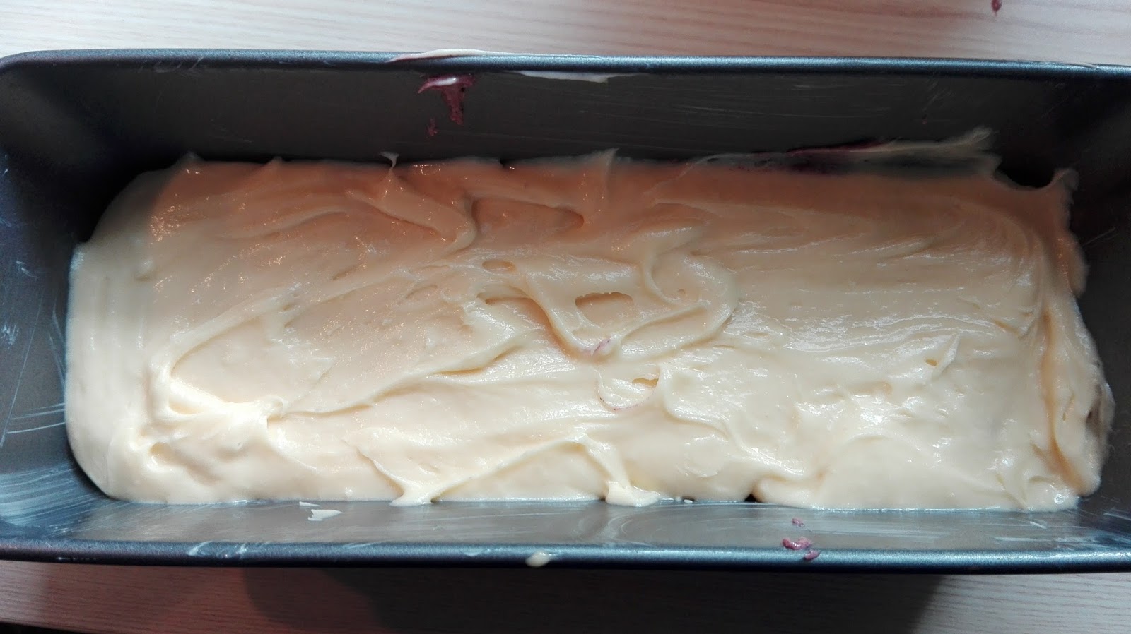 Zuerst den Brombeer-Teig einfüllen und glatt streichen. Dann vorsichtig den Kokos-Teig darüber geben. Mit einer Gabel das typische Mamorkuchen-Muster erzeugen in dem man mit der Gabel vorsichtig von unten nach oben in kreisenden Bewegungen die beiden Teige mischt.
