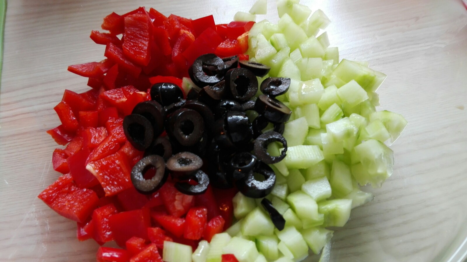 Dafür Salatgurke schälen und entkernen. Dann in kleine Stücke schneiden. Paprika waschen, Kerne entfernen und dann ebenfalls in kleine Stücke schneiden.