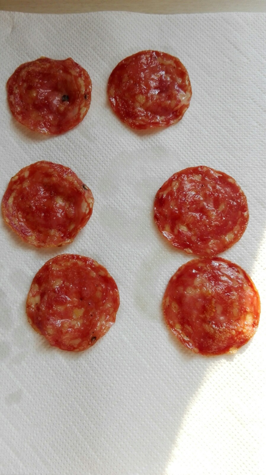 Vor dem Servieren die Salami in einer Pfanne ohne Fett knusprig braten und dann auf einem Küchenpapier das Fett etwas abtropfen lassen.