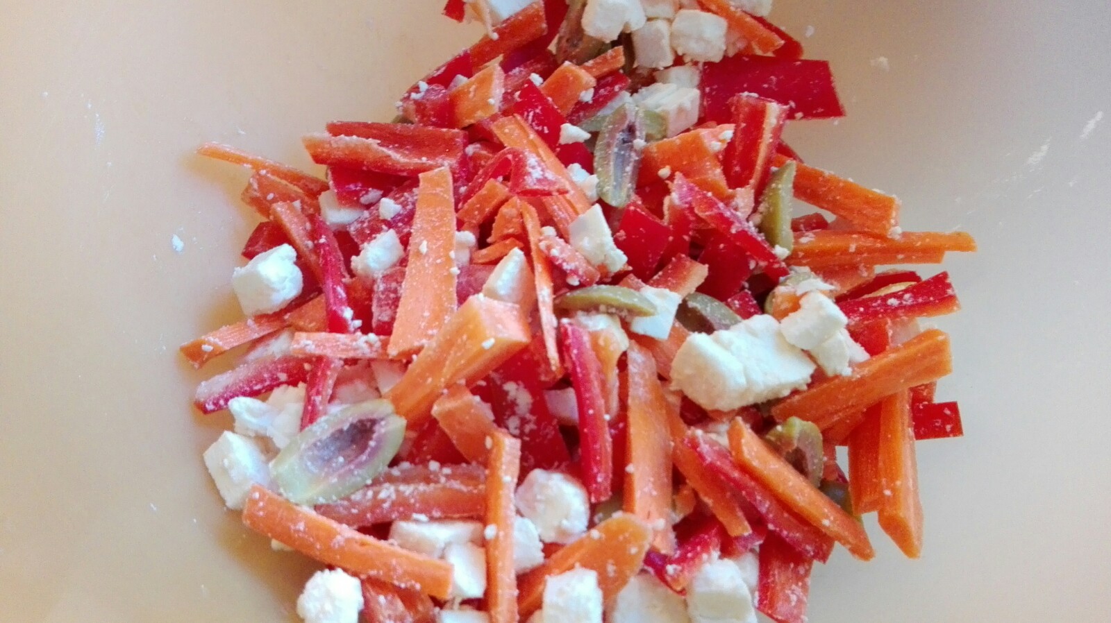 Oliven vierteln und ebenfalls zu dem Gemüse geben. Knoblauch fein hacken und auch dazu geben.
