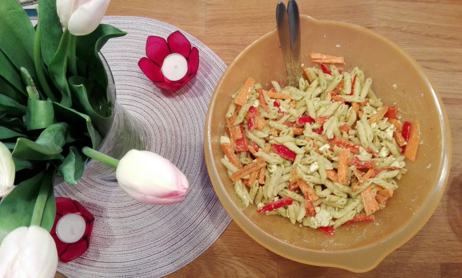 Nudeln gut abtropfen lassen und wenn sie erkaltet sind mit zu dem Gemüse geben und gut durchmischen.