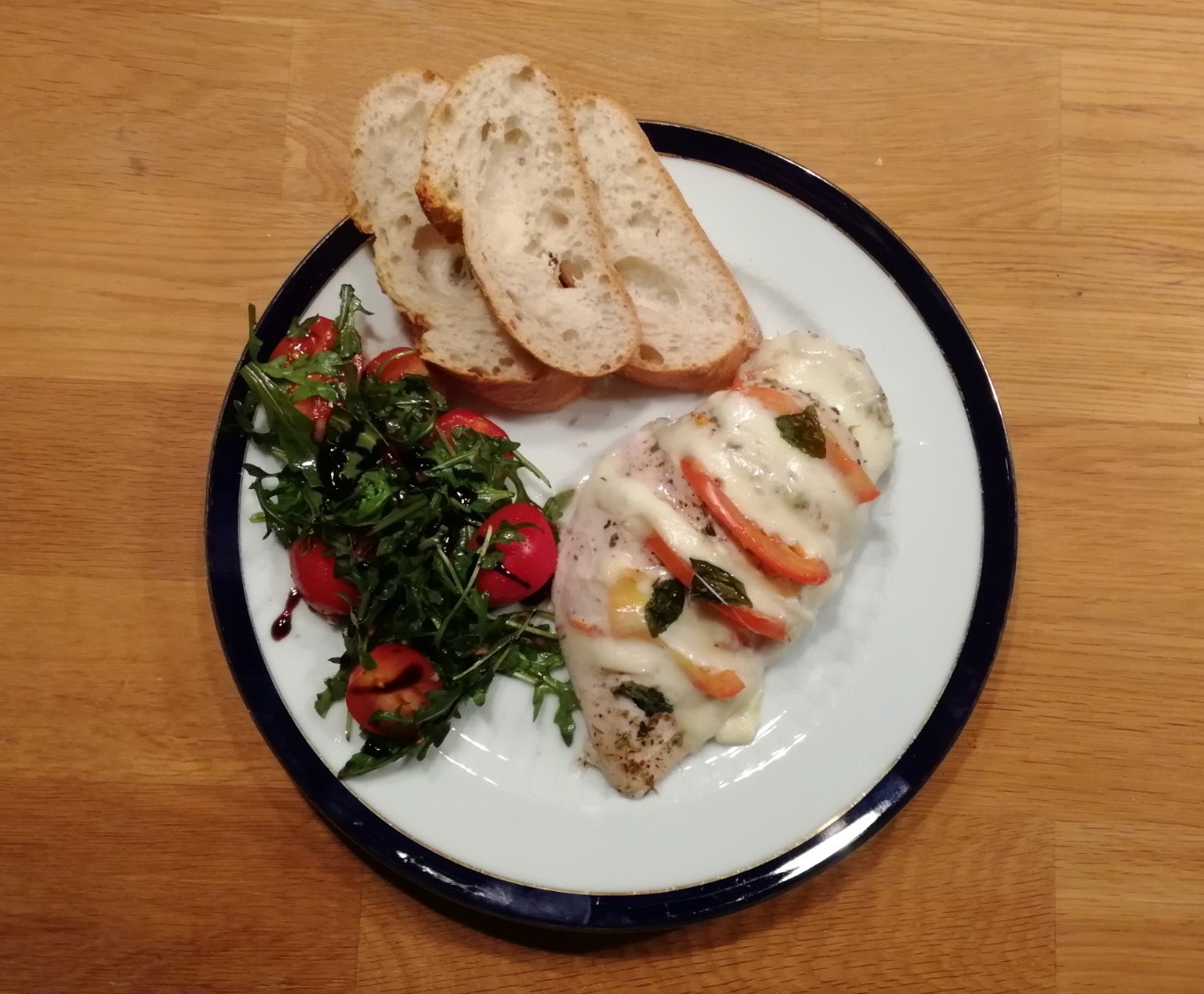 Der Star bei diesem Gericht ist natürlich die Hähnchenbrust, und daher gibt es dazu nur ein Baguette und etwas Rucola-Tomaten Salat. So stiehlt man dem Hauptbericht nicht die Show.