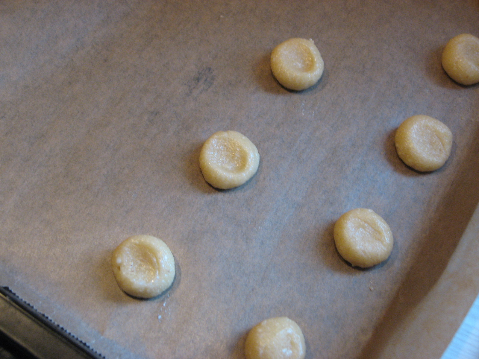 Backblech mit Backpapier auslegen und mit befeuchteten Händen kleine Kugeln formen und diese auf das Backblech legen. Leicht eindrücken.