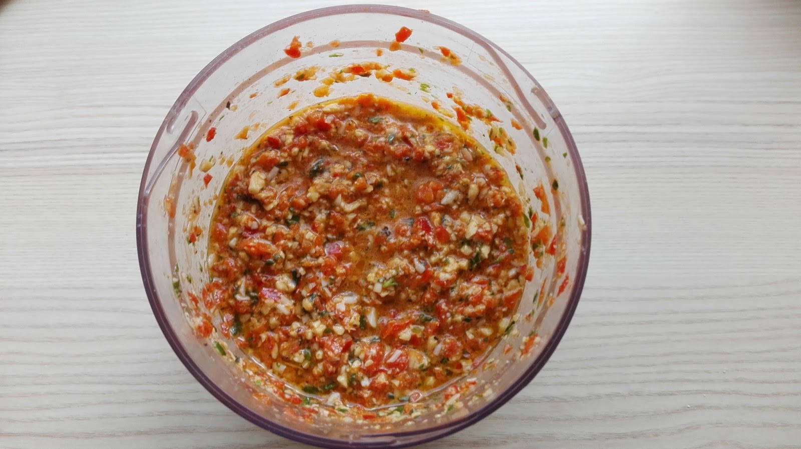 Alle Zutaten kommen nun in einen Mixer und werden zu einer groben Paste gemixt.