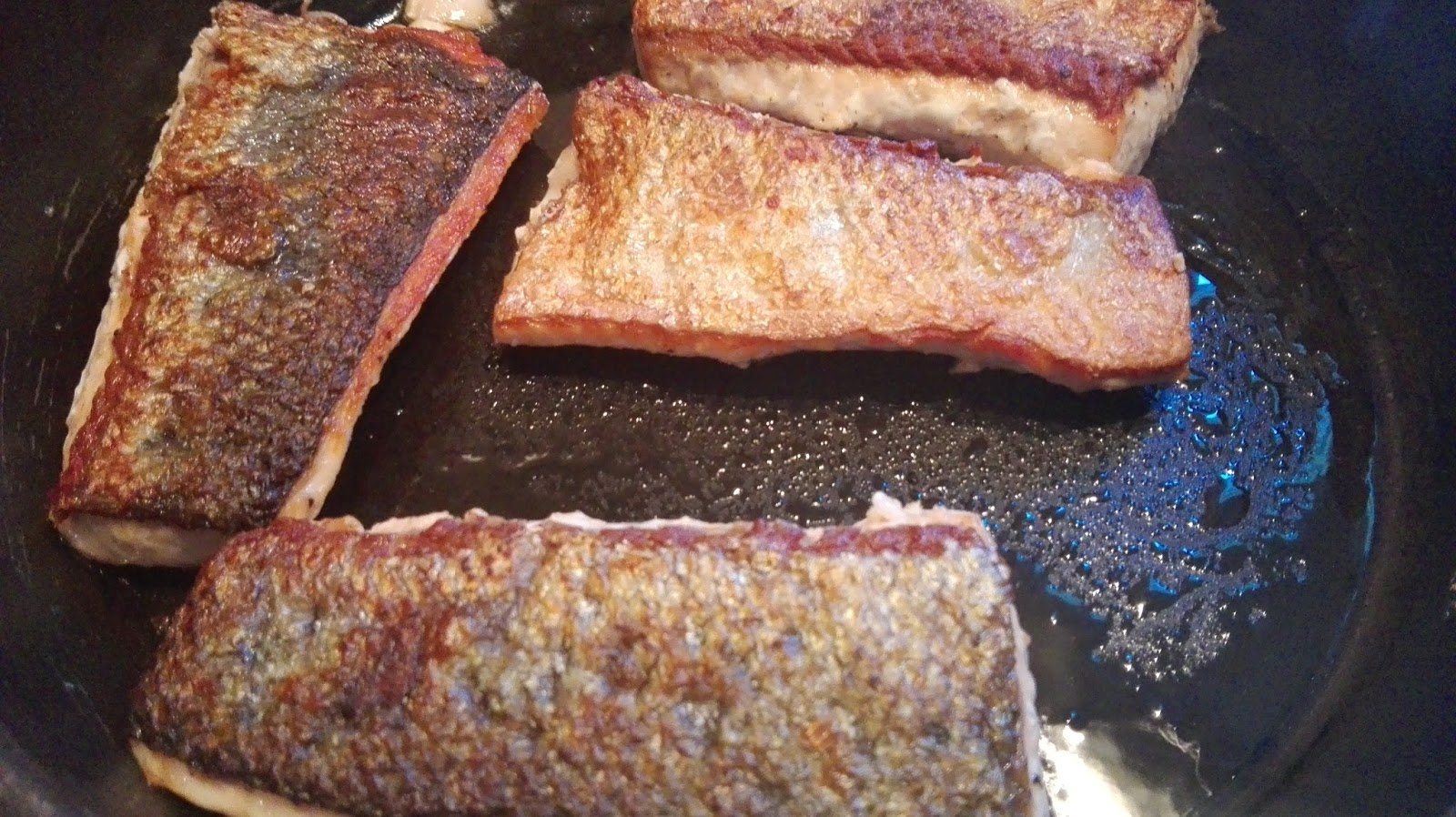 Für den Lachs habe ich die Filetseite mit Salz und Pfeffer gewürzt und zuerst mit der Hautseite in einer Pfanne kross angebraten.
