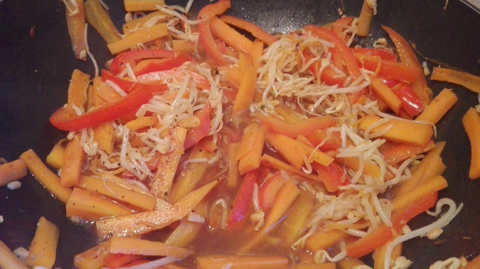 Etwas Öl in einer Pfanne oder Wok erhitzen, Karotten darin kräftig anbraten. Nach und nach das andere Gemüse und den Knoblauch dazugeben und anbraten.
