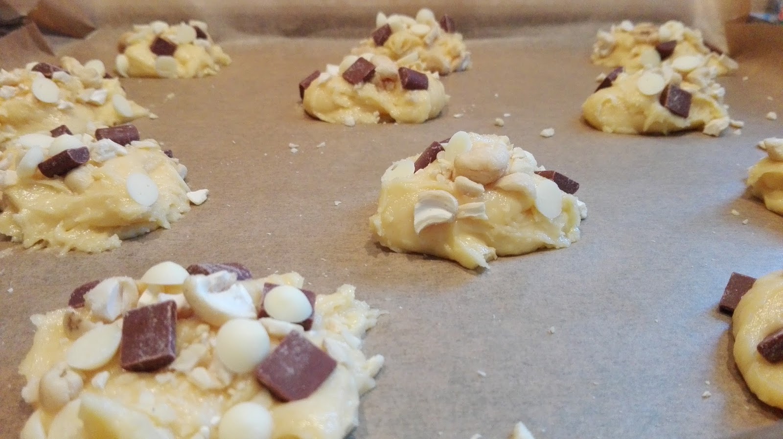 Cashewkerne in einen Gefrierbeutel geben und grob zerkleinern und auf dem Teig verteilen. Ebenso die Schokolade verteilen. Ich hatte weiße und dunkle Schokolade genommen.