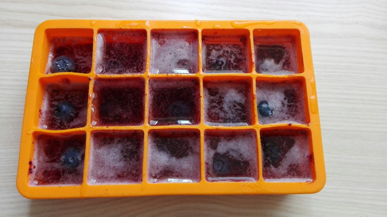 In den Eiswürfelbehälter eine Schicht von dem Blaubeer-Cassis-Püree geben.
