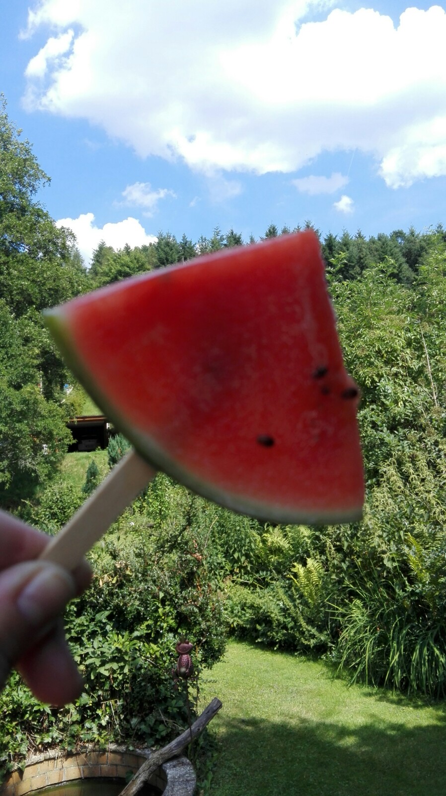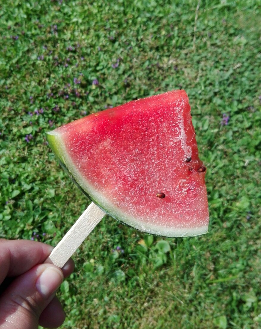 Und dann braucht man nur noch einen heißen Tag mit viel Sonne und dem Wunsch nach etwas Abkühlung. Denn das Wassermelonen-Eis schmeckt nicht nur super sondern kühlt auch wunderbar ab. Und das Dank des Stäbchens, ohne klebrige Finger 🙂