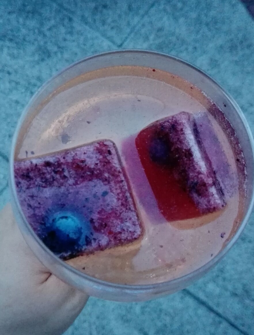 Nach der Stunde jeden Würfel mit Wasser auffüllen und eine ganze Blaubeere hineingeben.