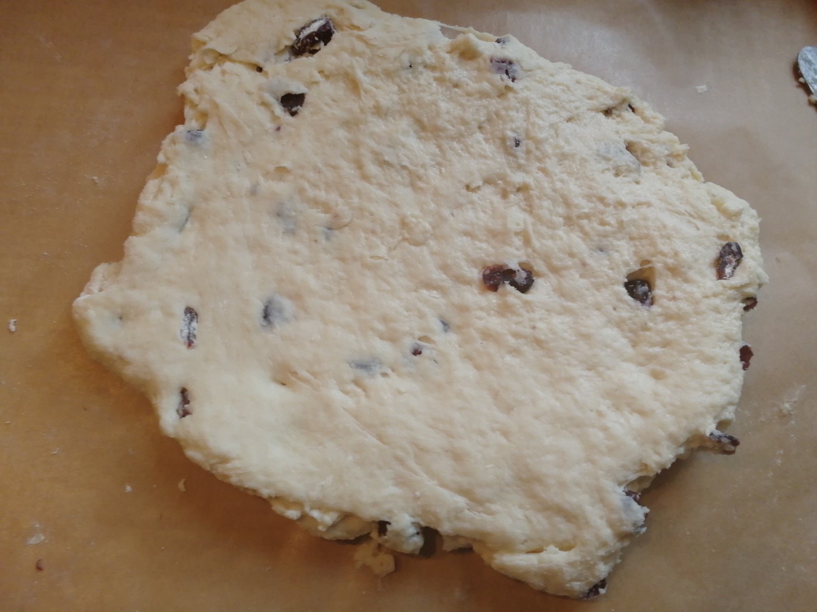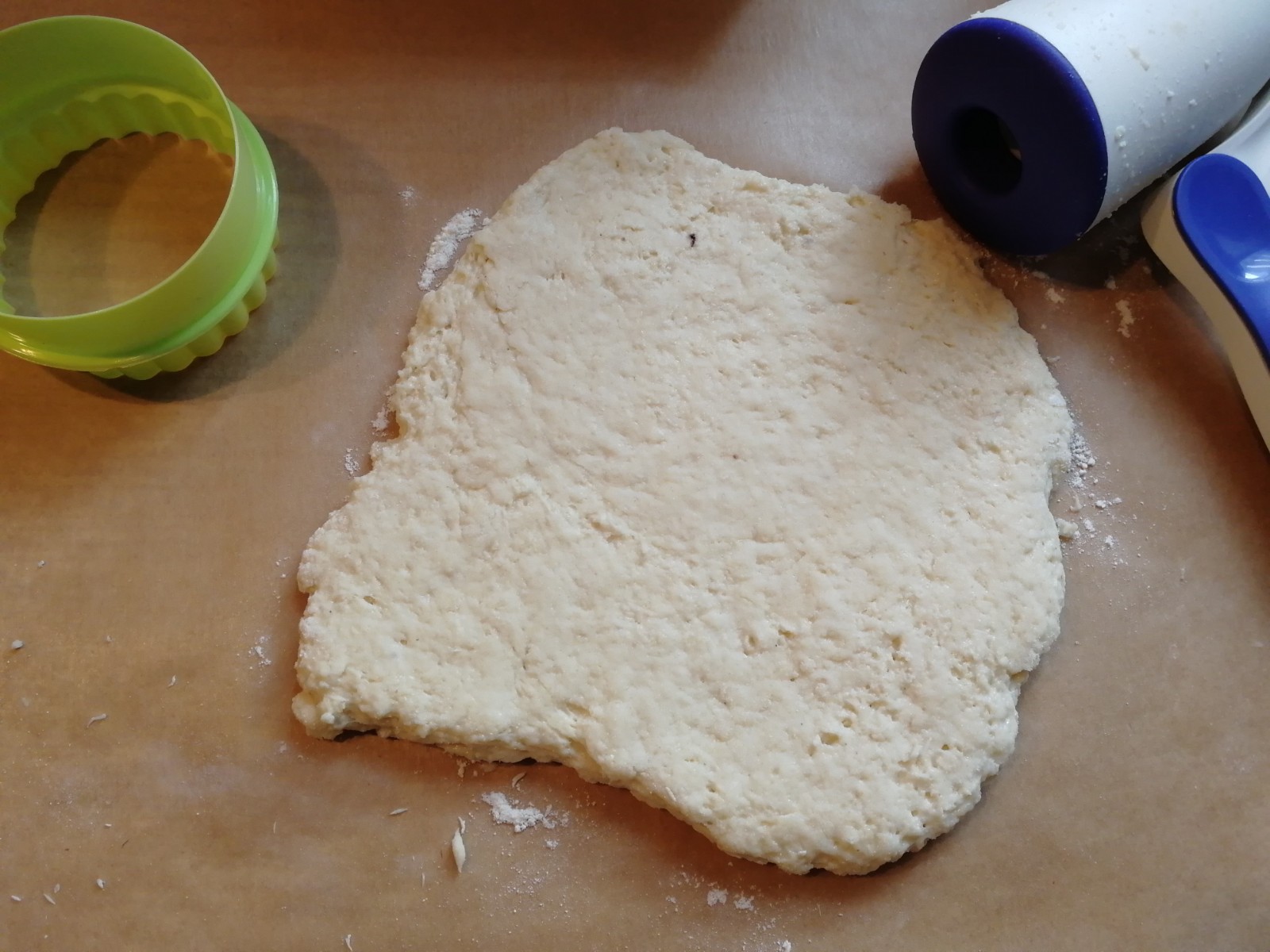 Da der Teig etwas klebrig ist, habe ich ein Backpapier als Unterlage zum ausrollen genommen. Nicht zu dünn ausrollen.