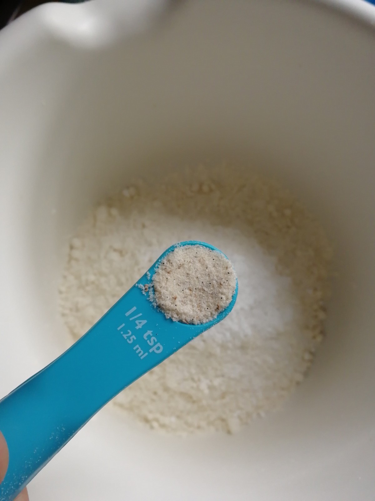 Mehl, Backpulver, Vanillesalz und Zucker in einer Schüssel vermengen.