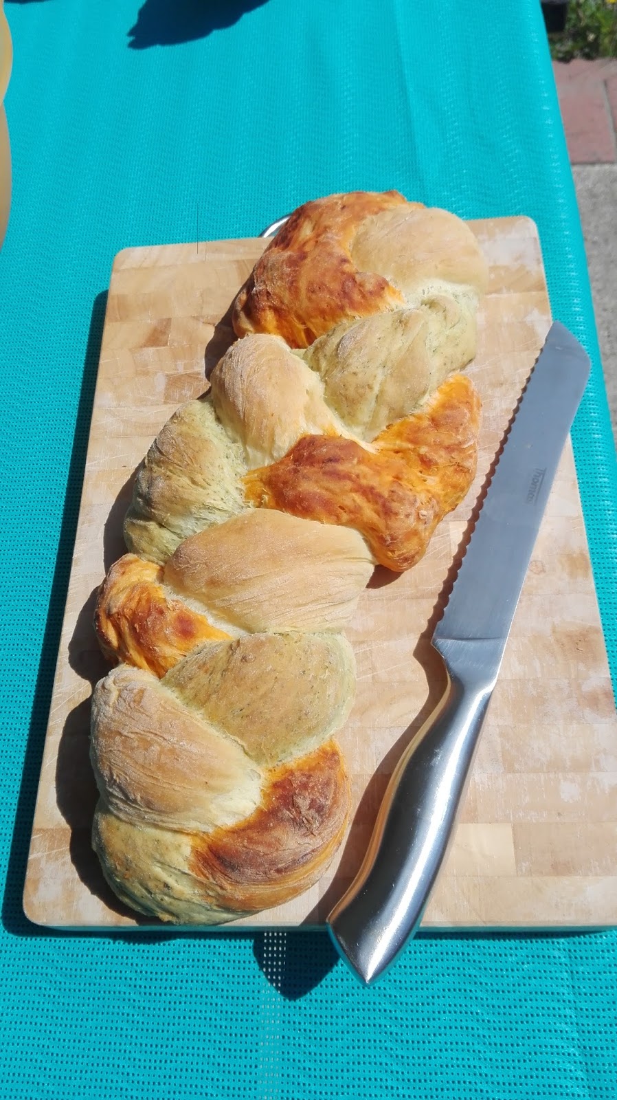 Der erste Teil wird nicht eingefärbt. Für den zweiten Teil 2-3 TL Pesto in den Teig einkneten. Ist eine sehr schmierige Angelegenheit, aber es lohnt sich.