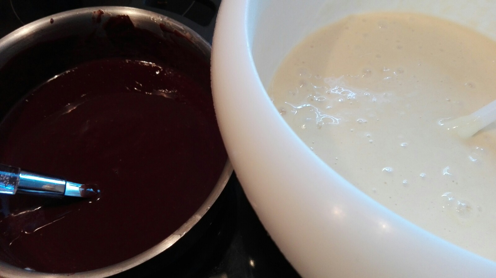 Anschließend das Butter-Schokolade Gemisch in kleinen Mengen dazugeben und gut unterrühren. So mit der ganzen Masse vorgehen bis alles aufgebraucht ist.