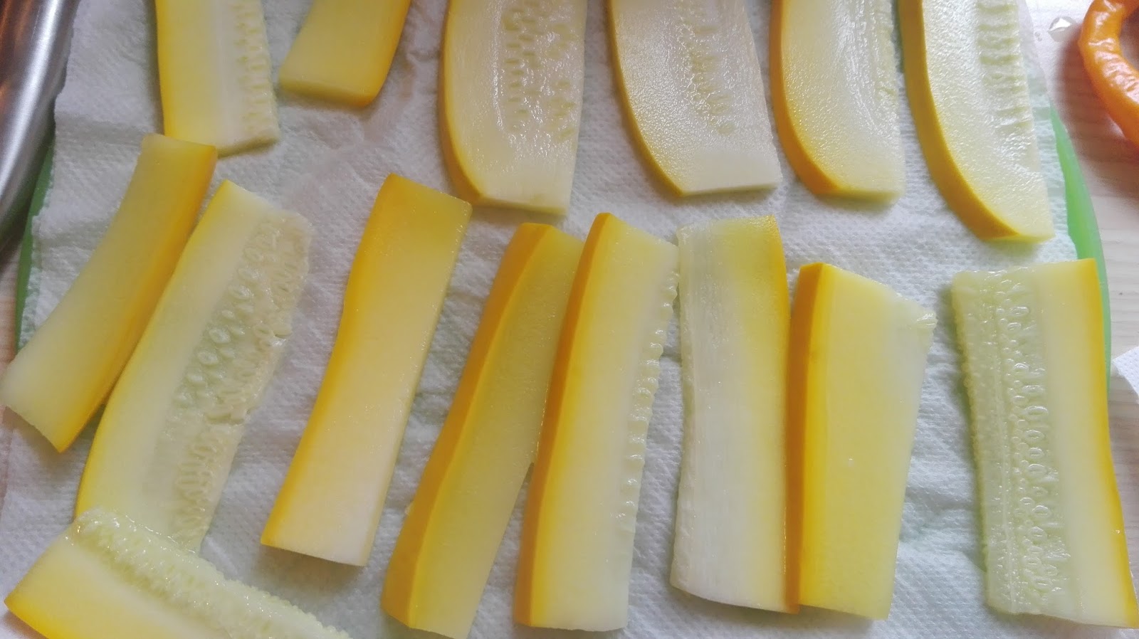 Dann abschöpfen und mit einem Küchentuch sorgfältig abtrocknen. Das ist wichtig, da die Zucchinistreifen gleich ins heiße Öl kommen und dann spritzt es sehr wenn die Streifen noch zu nass sind.
