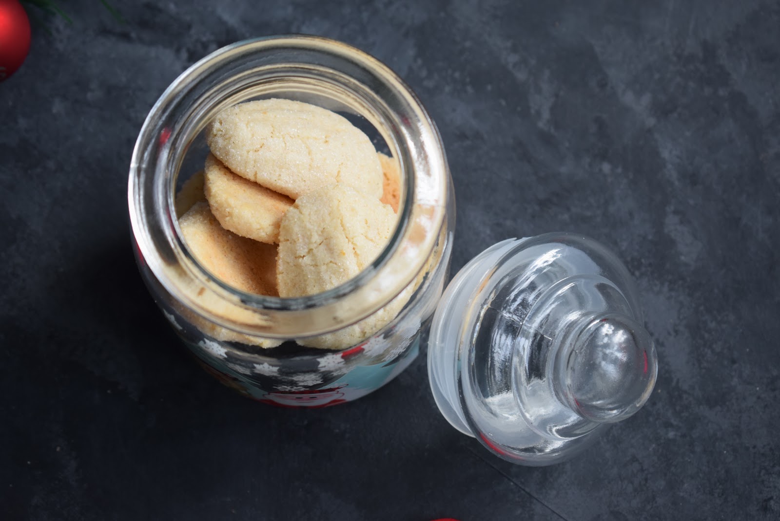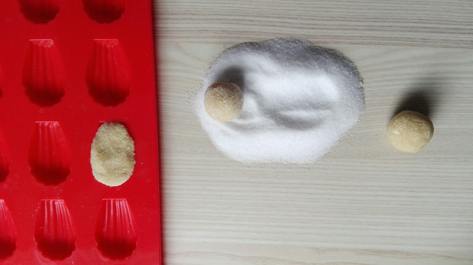 Nun kleine Kugeln formen und in Zucker wälzen. Entweder in eine kleine Madeleine-Form drücken und dann auf ein mit Backpapier ausgelegtes Backblech legen oder mit der Gabel flach drücken.