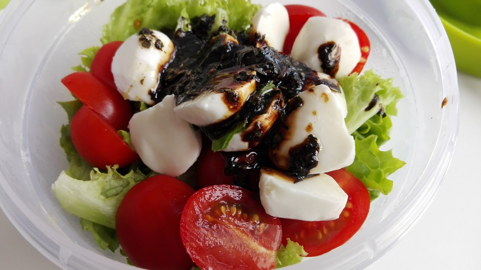 Zum Testen habe ich einen Blattsalat mit Tomaten, Mozzarella, Basilikum und Cashew-Kernen mitgenommen. Das Dressing ist ein Balsamico-Basilikum Dressing.