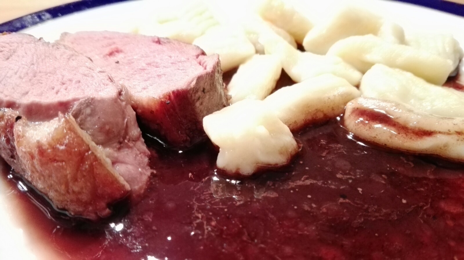 Meine bessere Hälfte packt auch noch Rotkohl dazu, aber da ich den nicht mag, ist mein Teller immer etwas leerer – aber mir reicht eigentlich die Soße mit Nudeln und ein bisschen Entenbrust.