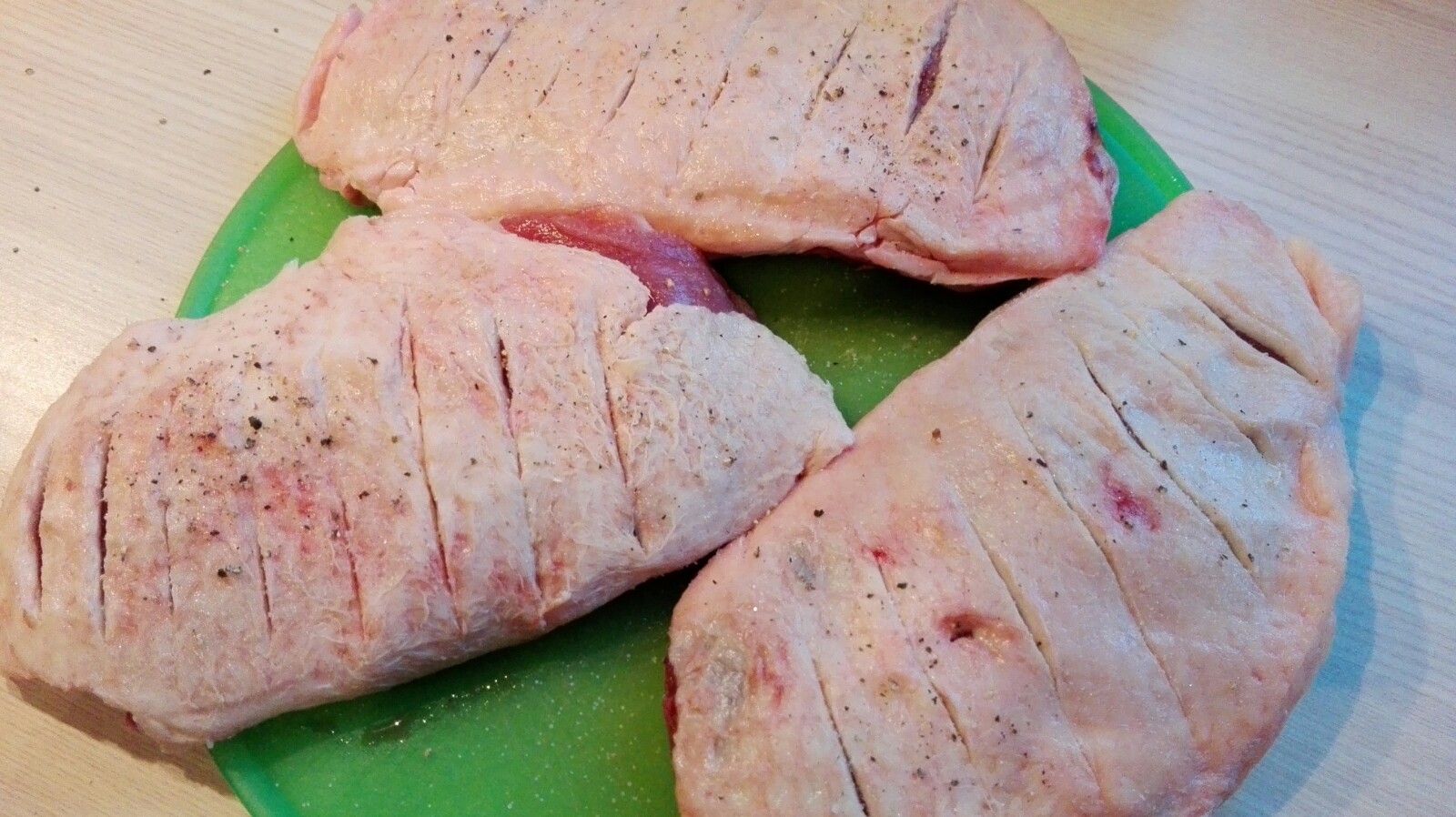 Entenbrust ggf. auftauen lassen und dann gut abwaschen und trocken tupfen.