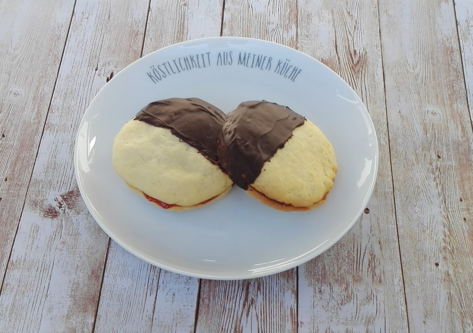 Wenn sie abgekühlt sind mit Marmelade (ich bevorzuge eine rote Marmelade wegen dem Kontrast – dieses mal Erdbeere – aber man kann natürlich nehmen was einem am besten schmeckt bzw. was man gerade noch zu Hause hat) bestreichen und zwei Hälften aufeinanderlegen.