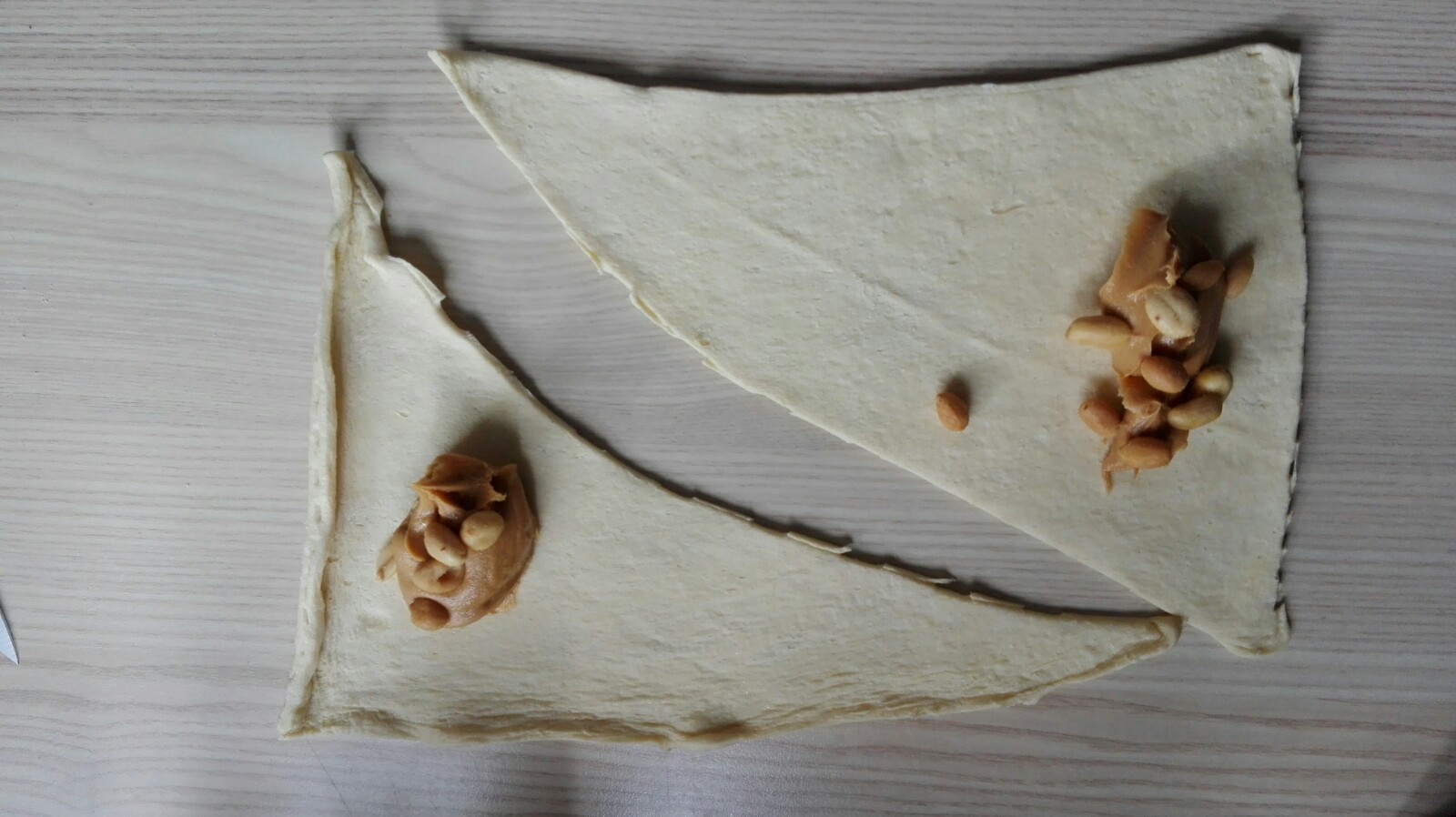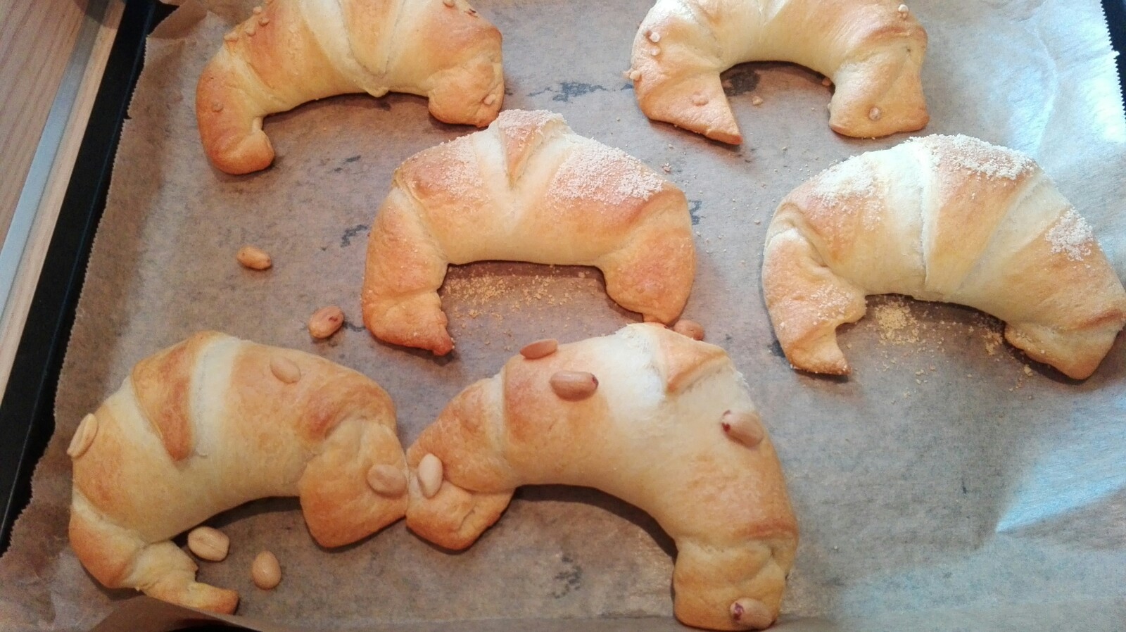 Ich hatte jedes Hörnchen dann von Außen auch noch entweder mit Krokant, Mandeln oder Erdnüssen belegt, damit ich später auch wusste in welchem Hörnchen welche Füllung ist 🙂