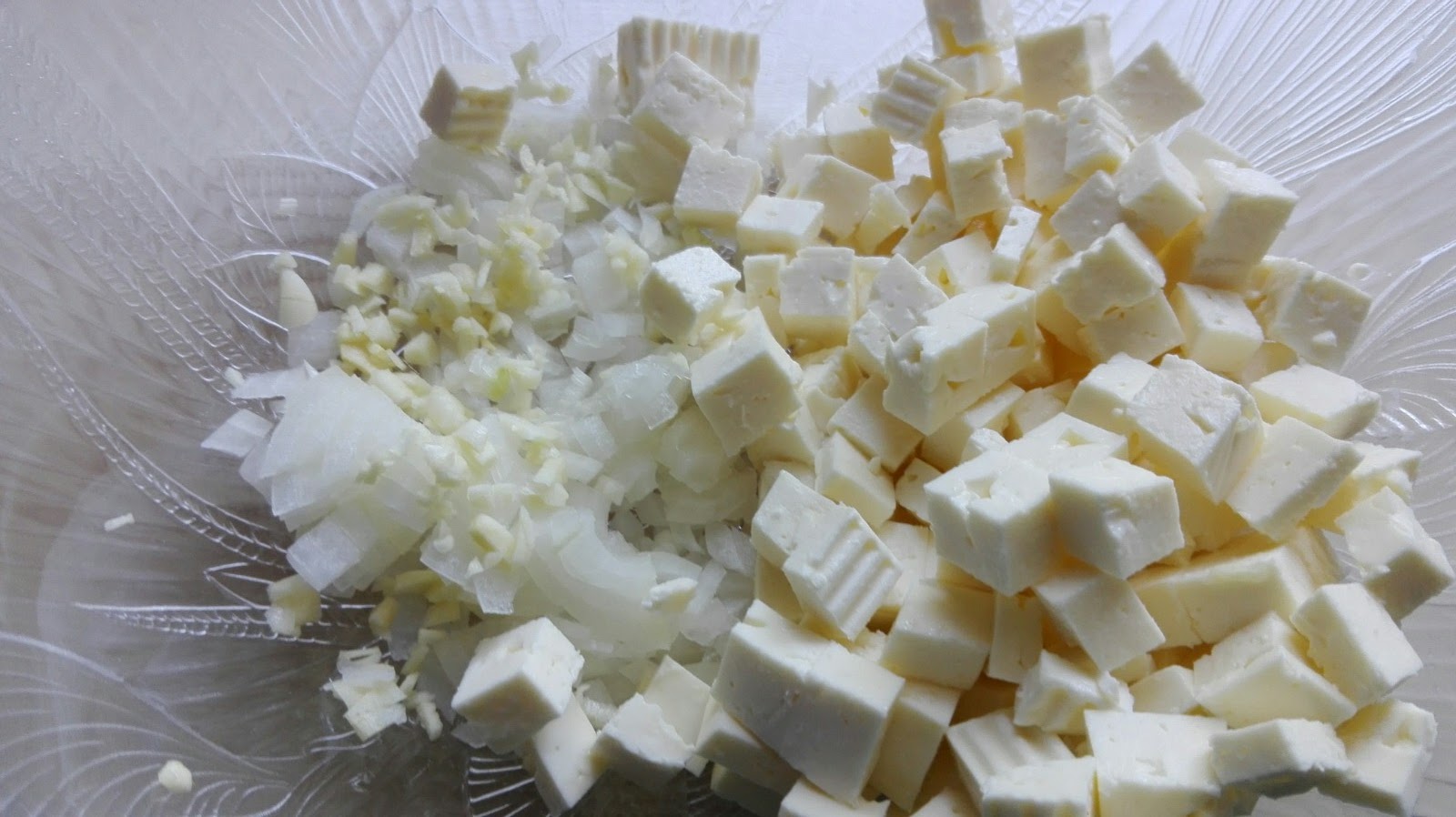 Für die Füllung nun das Hackfleisch in eine Schüssel geben. Zwiebeln und Knoblauch fein hacken. Feta in kleine Stücke würfeln und Oliven ebenfalls vierteln.