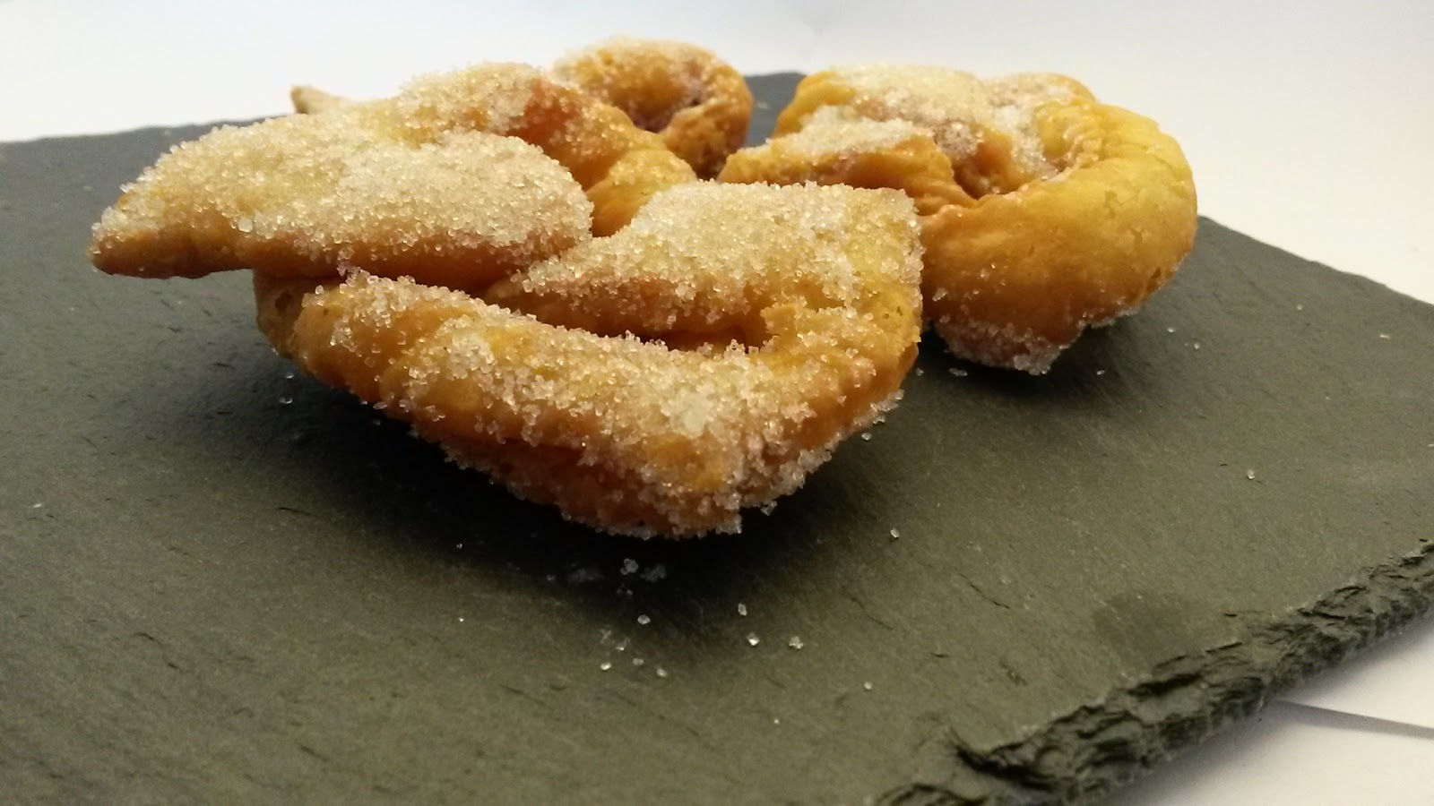 Dann die Teigschnitte verknoten und ins heiße Fett geben und ausbacken bis sie goldbraun sind. Auf Küchenpapier abtropfen lassen und dann mit Zucker bestreuen.
