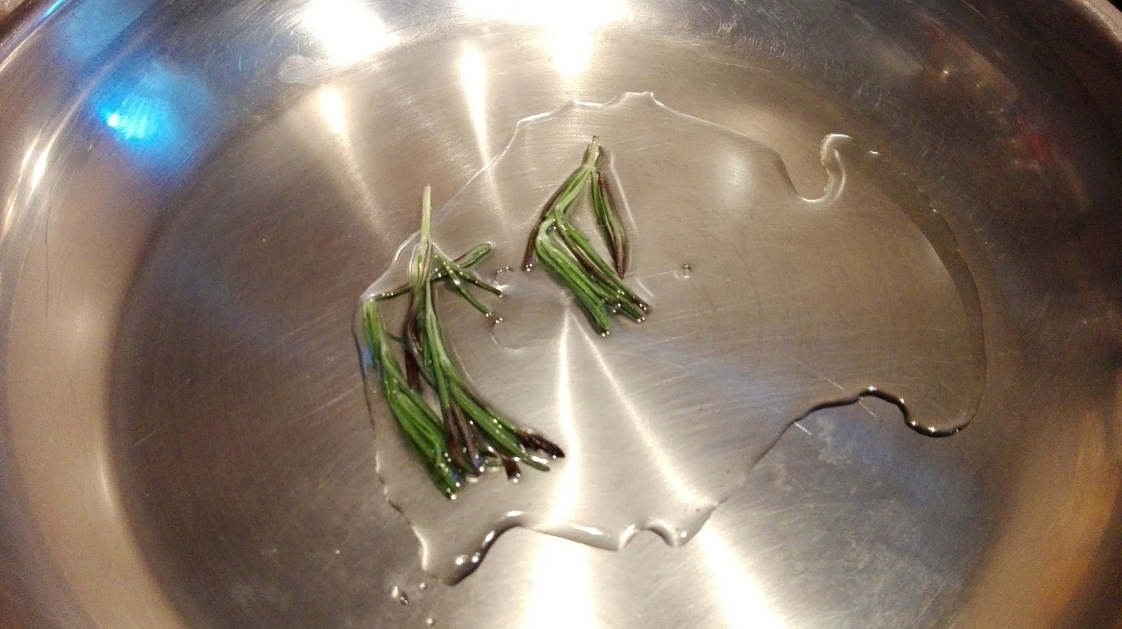 Eine Pfanne mit etwas Öl und einem Rosmarinzweig erhitzen.