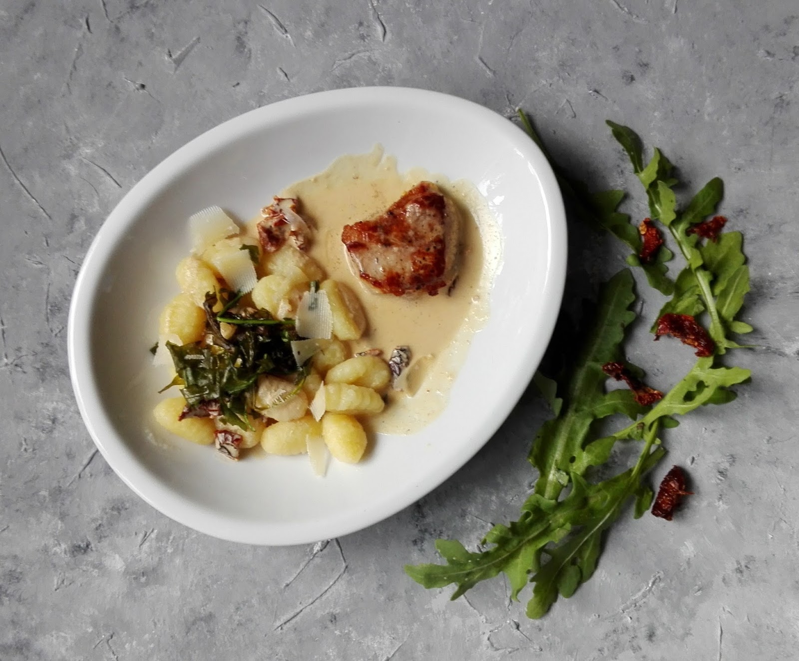 Gnocchi mit Weißweinsoße mit knusprigen Rucola dazu Kalbsfilet