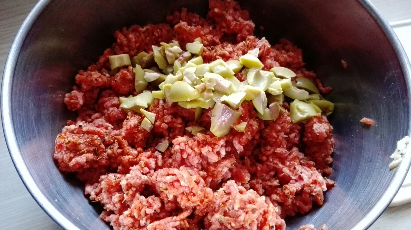Diese Zutaten dann unter das Hackfleisch mischen und ggf. noch mit Salz und Pfeffer abschmecken, je nach den Gewürzen die man hinzugegeben hat.