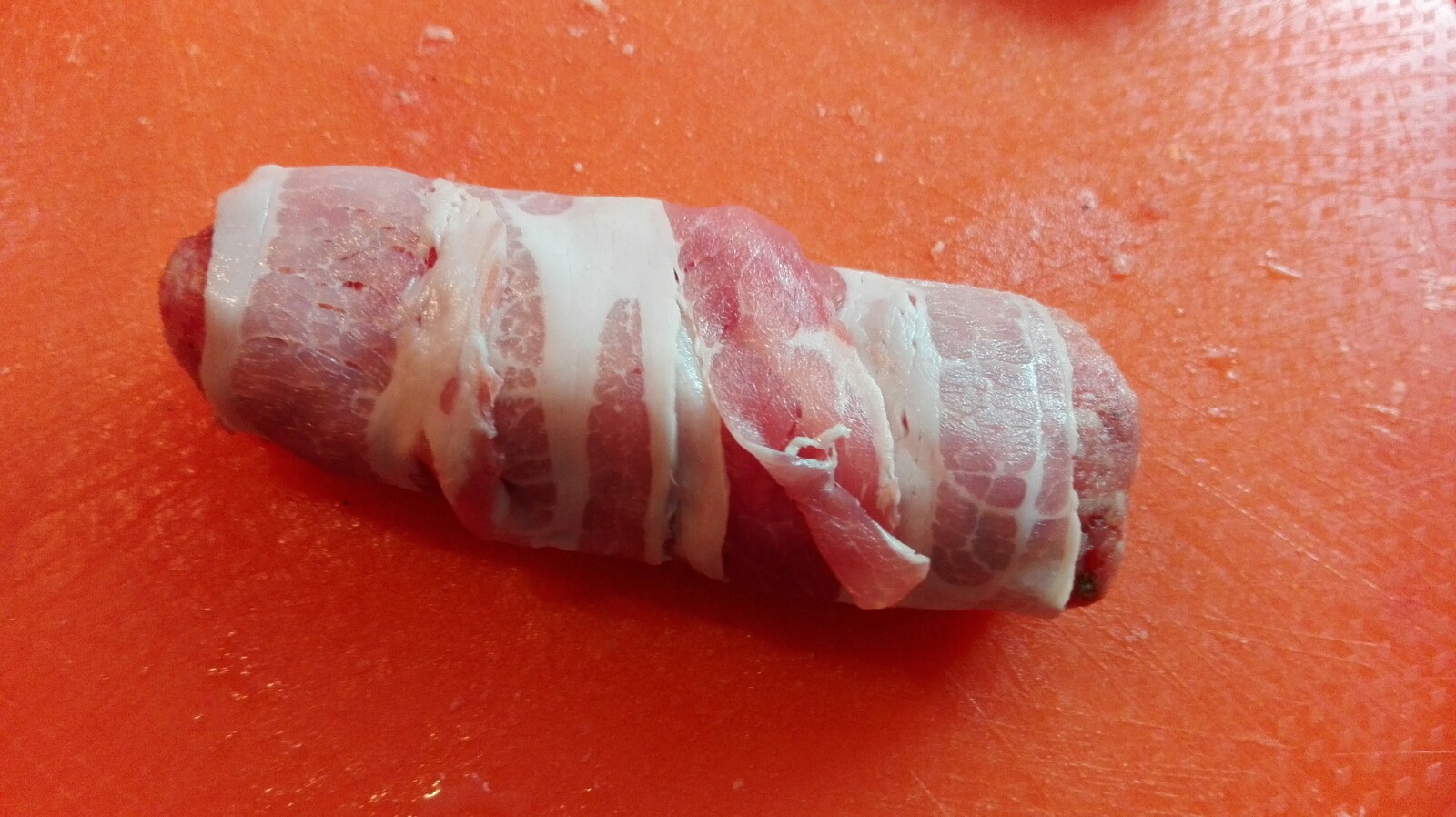 Nun ein Stück Speck nehmen und das Röllchen damit umwickeln.