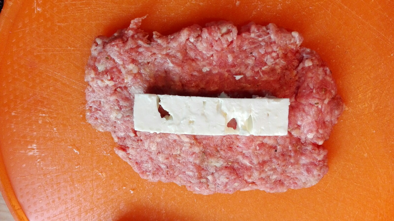 Nun ein Stück Feta auf das Hackfleisch legen und den Käse mit dem Hackfleisch einrollen. Hier ist es wichtig, dass der Feta gut umschlossen ist, damit er später beim grillen nicht aus den Röllchen läuft.