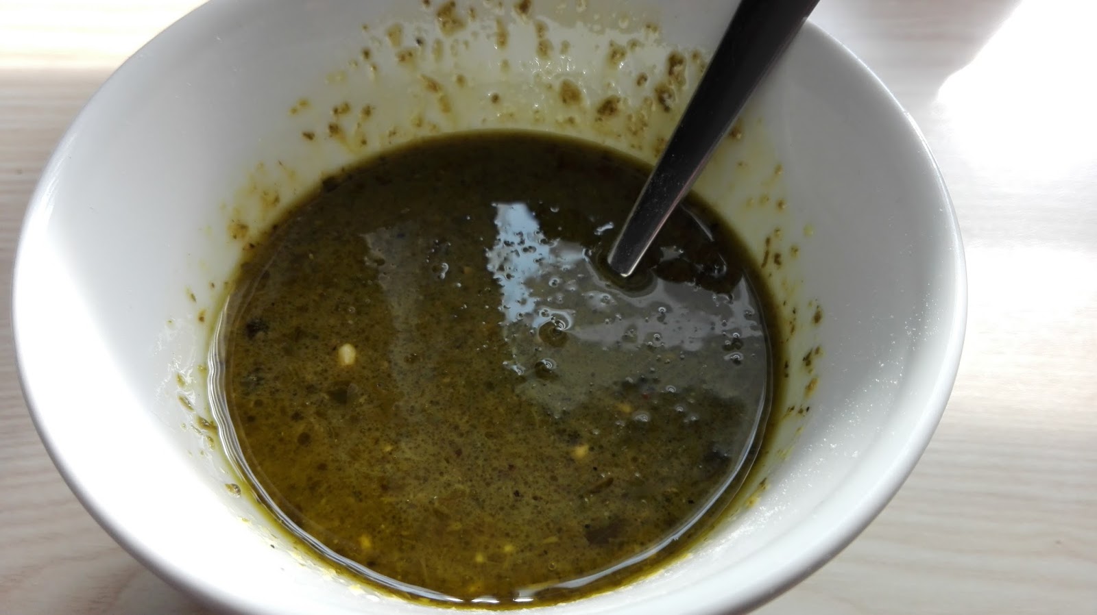 Nun die Zutaten für das Dressing miteinander vermischen. Bei dem Essig kann ich keine genaue Angabe machen, da ich diesen immer nach Gefühl dazu gebe. Vielleicht mit ein wenig anfangen und dann nach belieben mehr hinzugeben.