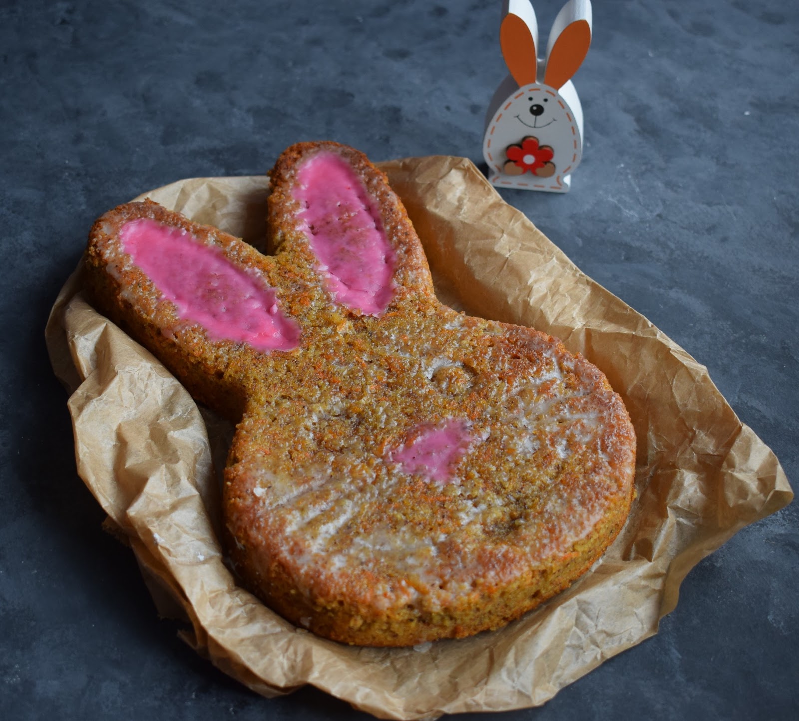 Mit der klassischen Puderzucker-Glasur ist es ein einfacher, trockener Kuchen, der keine Kühlung benötigt. Also perfekt um als Gastgeschenk mitgenommen zu werden oder wenn man einfach Lust auf einen normalen Kuchen hat. Mit dem weißen Rum verfärbt sich der Puderzucker nicht, so konnte ich auch für die Hasenform einen Teil in Rosa einfärben 🙂