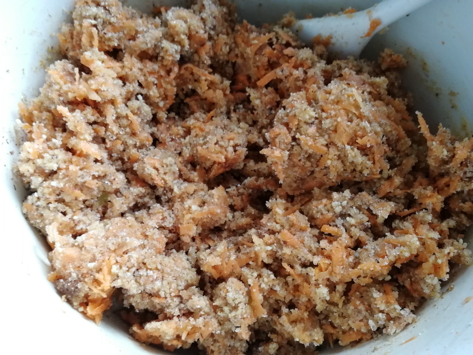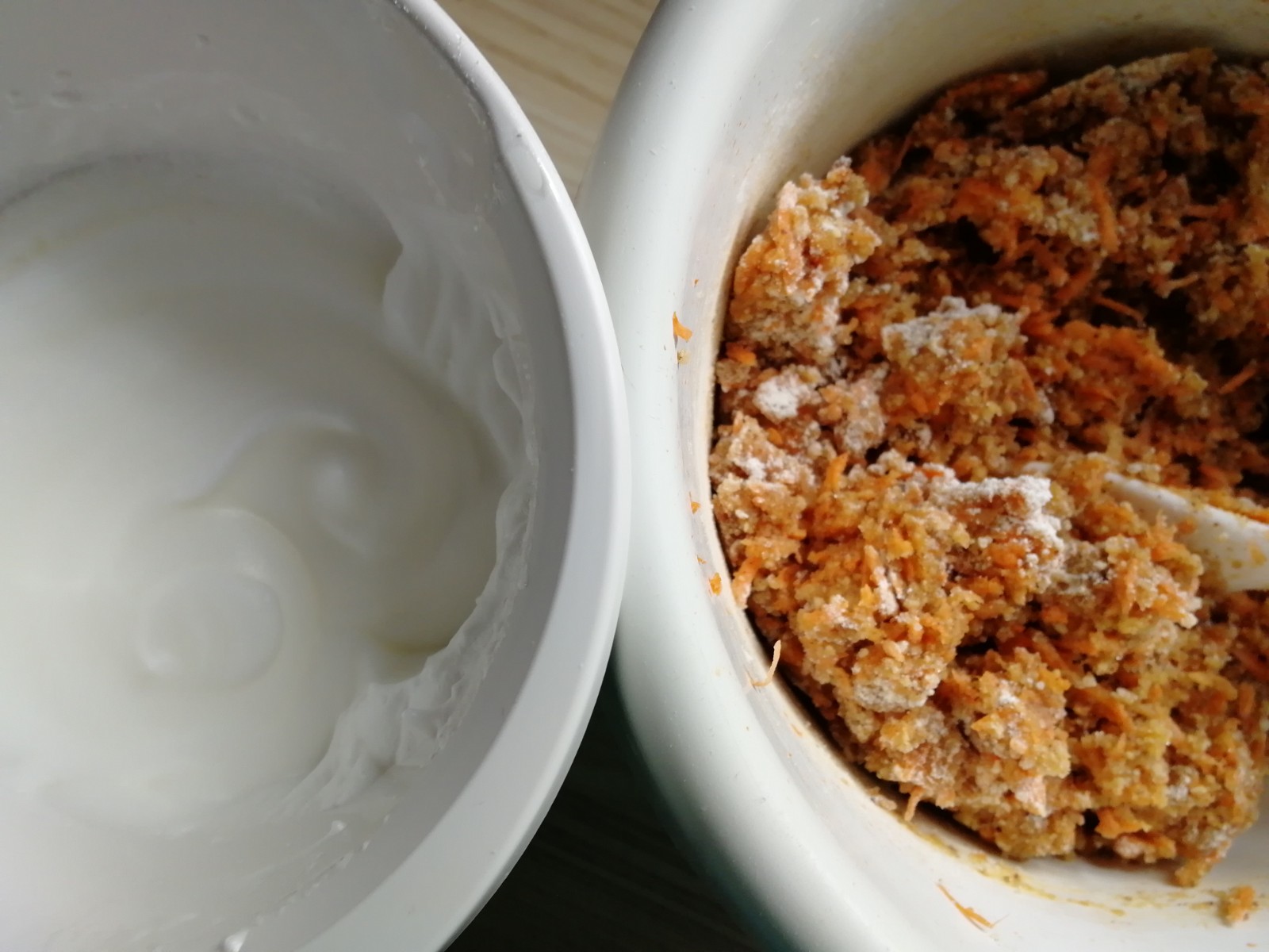 Karotten abwiegen, schälen und dann in feine Streifen raspeln. In eine Schüssel geben. Die Eigelb dazu geben und alles gut verrühren.