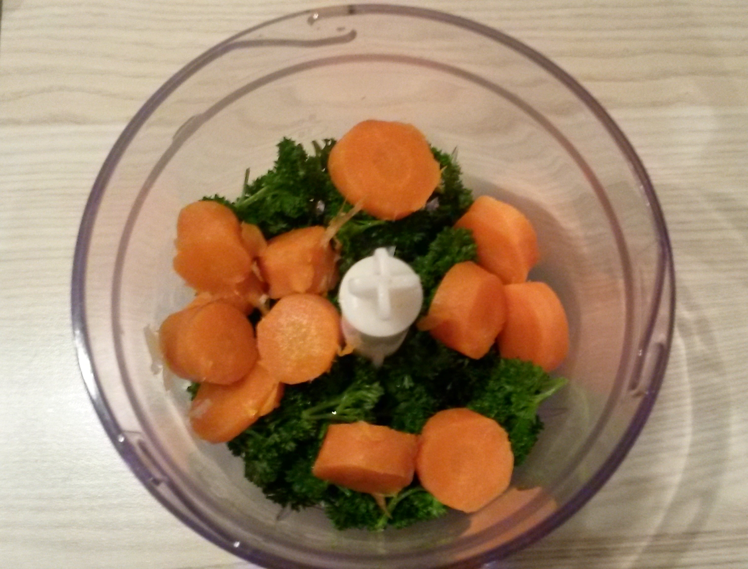 Kartoffeln stampfen und Karotte mit Petersilie zerkleinern.