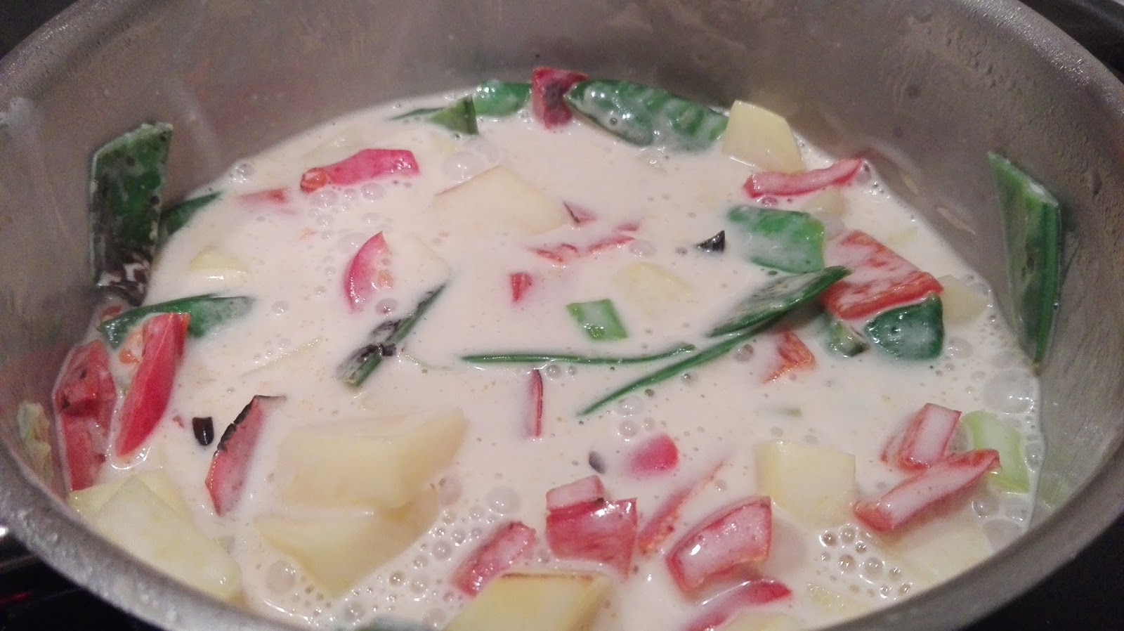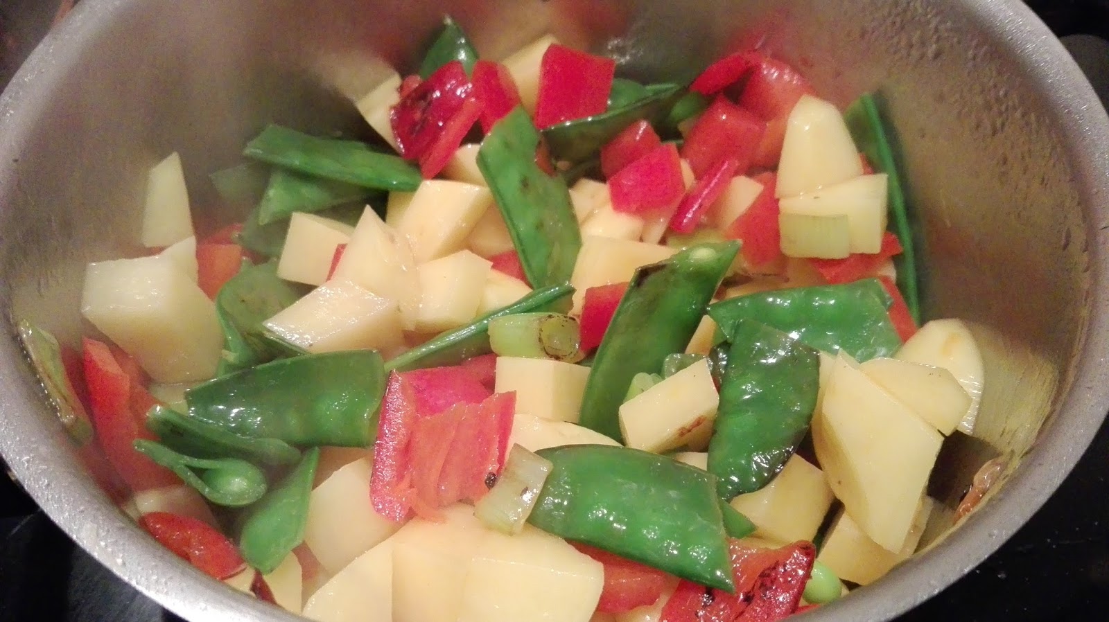 Öl in einem Topf erhitzen. Zwiebeln, Paprika und Zuckerschoten anbraten. Dann die Kartoffeln dazugeben und kurz mit anbraten. Dann mit der Kokosmilch ablöschen.