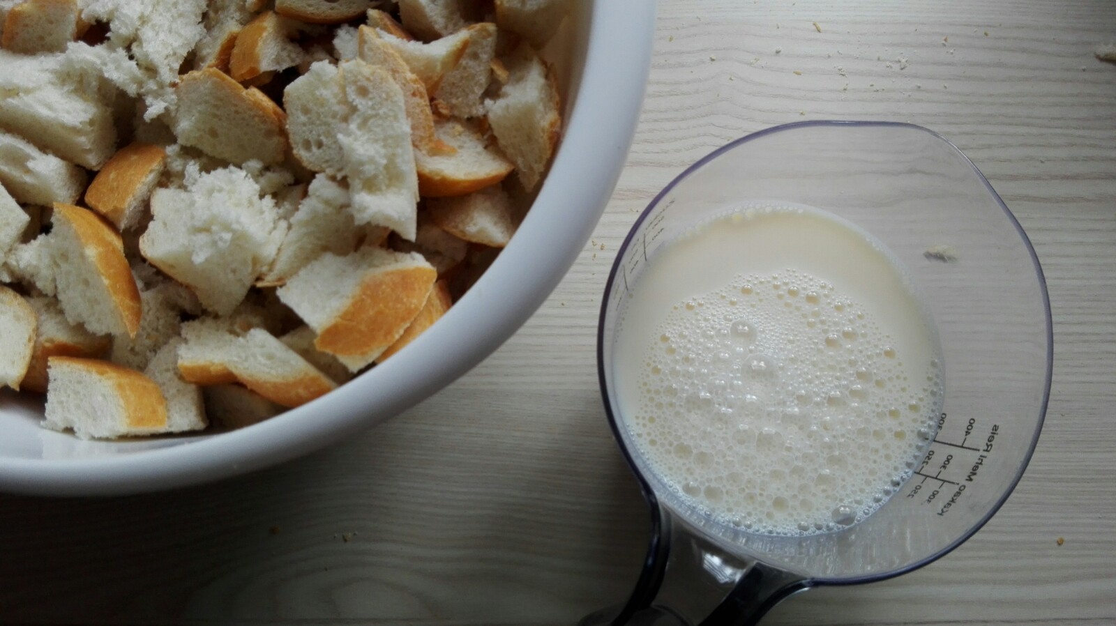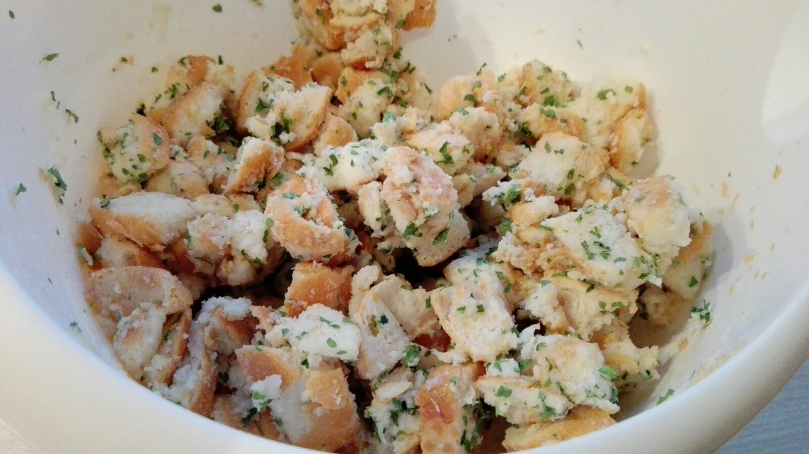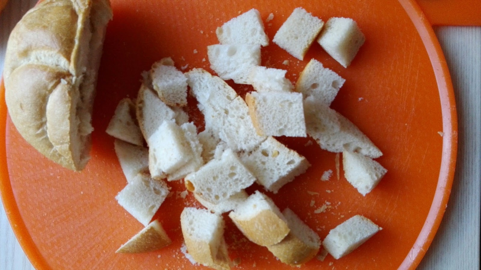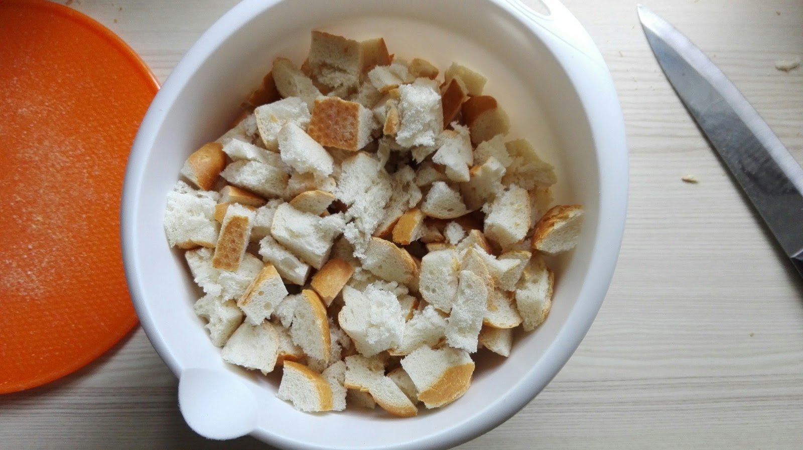 Brötchen in ca. 1 cm große Stücke schneiden und in eine große Schüssel geben.