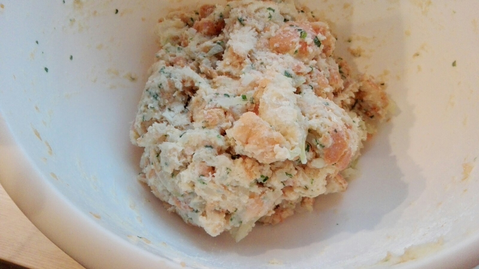Frische Petersilie waschen und fein hacken, alternativ geht auch gefriergetrocknete Petersilie. Diese auch zu den Brötchen geben und durchmischen.
